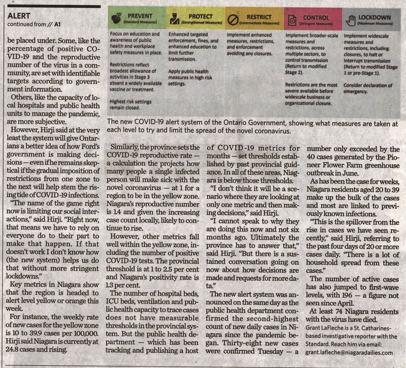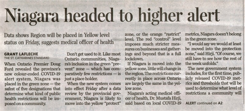 Niagara headed to higher alert : Data shows Region will be placed in Yellow level status on Friday, suggests medical officer of health