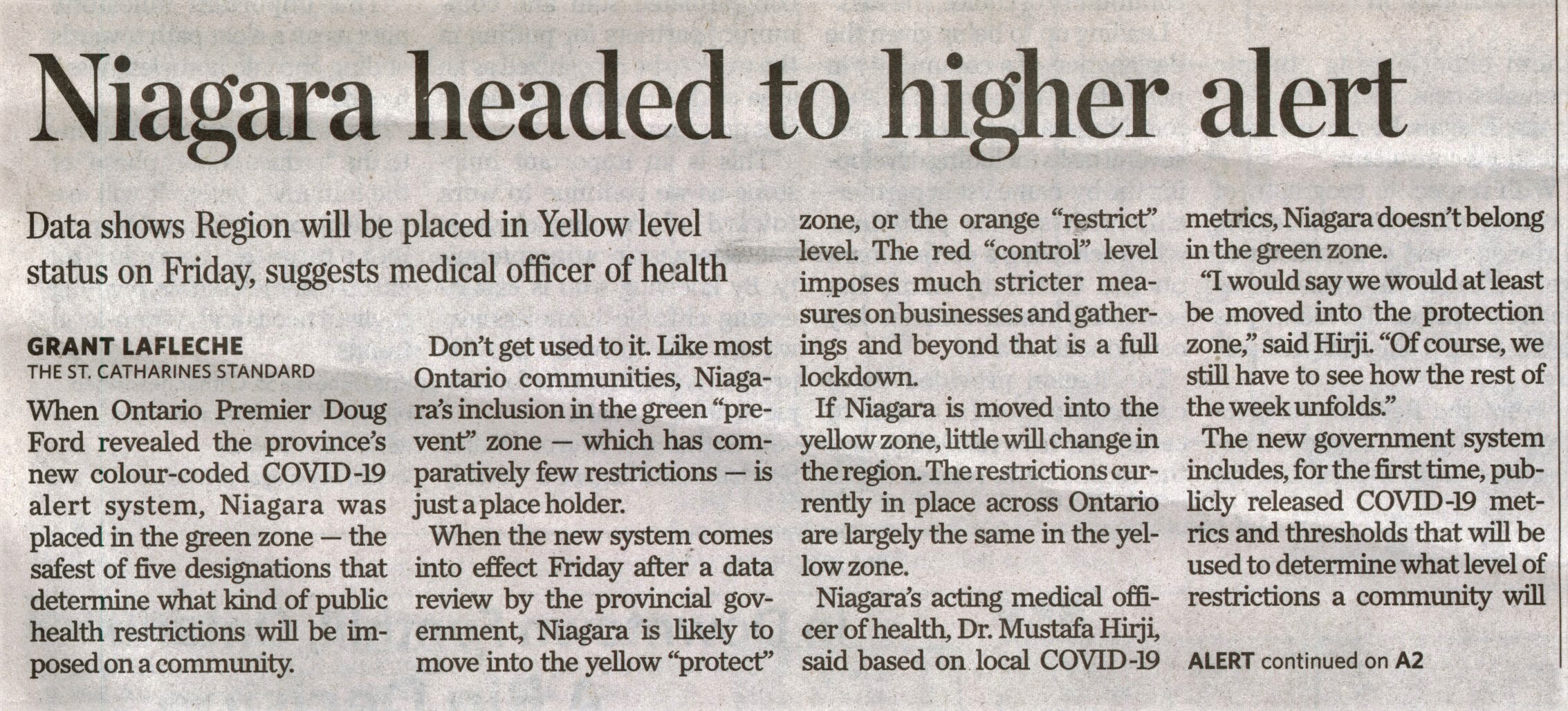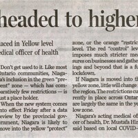 - Niagara headed to higher alert : Data shows Region will be placed in Yellow level status on Friday, suggests medical officer of health