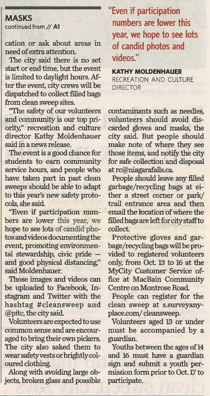 - Don't pick up masks during clean sweep, city says : the annual fall cleanup will be held Oct. 17 across Niagara Falls