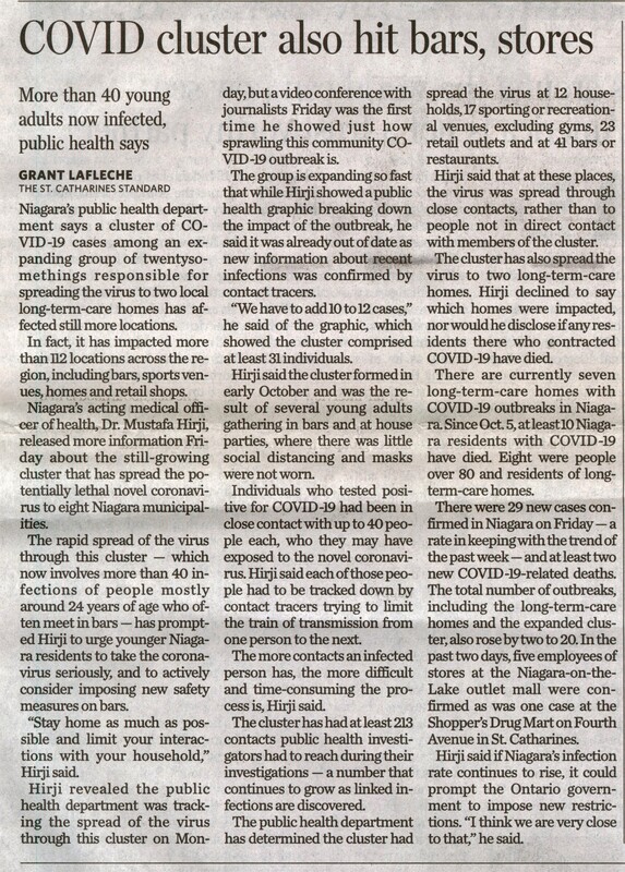 - Hirji, Mustafa Dr. / COVID-19 pandemic / long-term-care homes / businesses / clusters