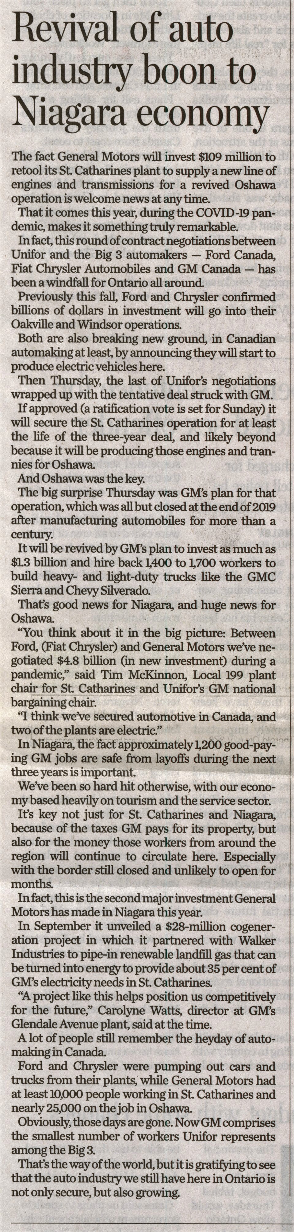- Revival of auto industry boon to Niagara economy