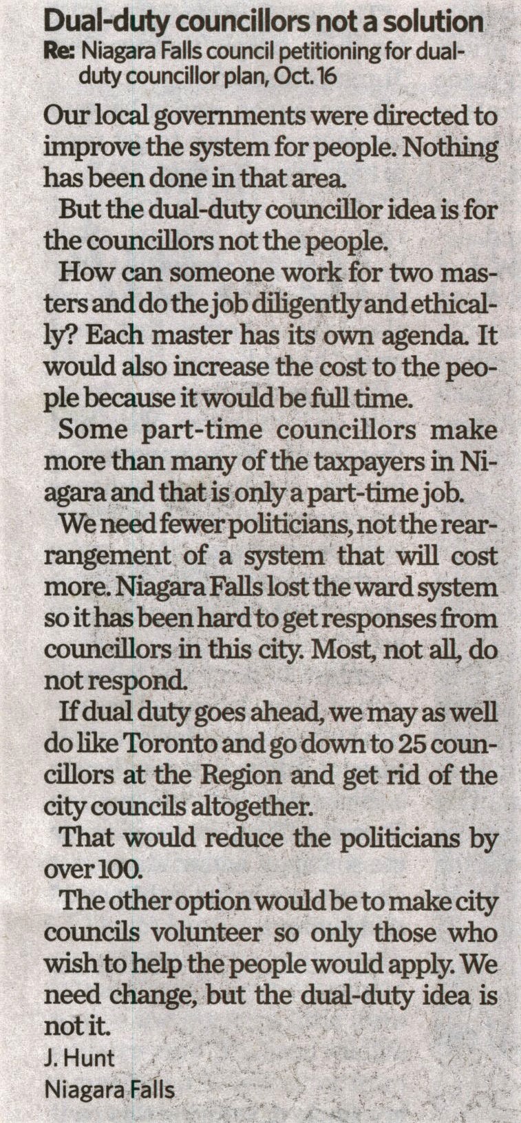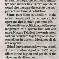 - Dual-duty councillors not a solution : Re: Niagara Falls council petitioning for dual-duty councillor plan, Oct. 16