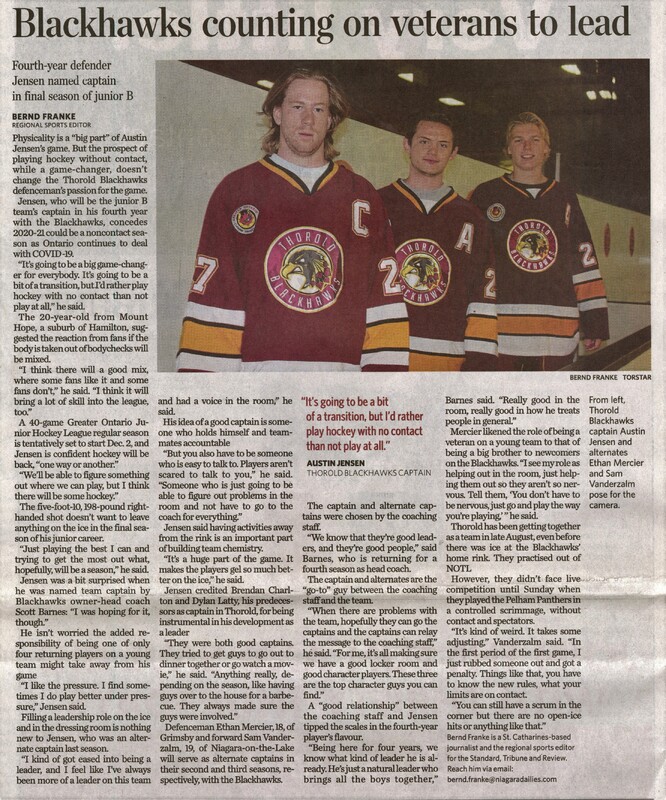 - Jensen, Austin / Mercier, Ethan / Vanderzalm, Sam / Thorold Blackhawks / no contact season / COVID-19 pandemic