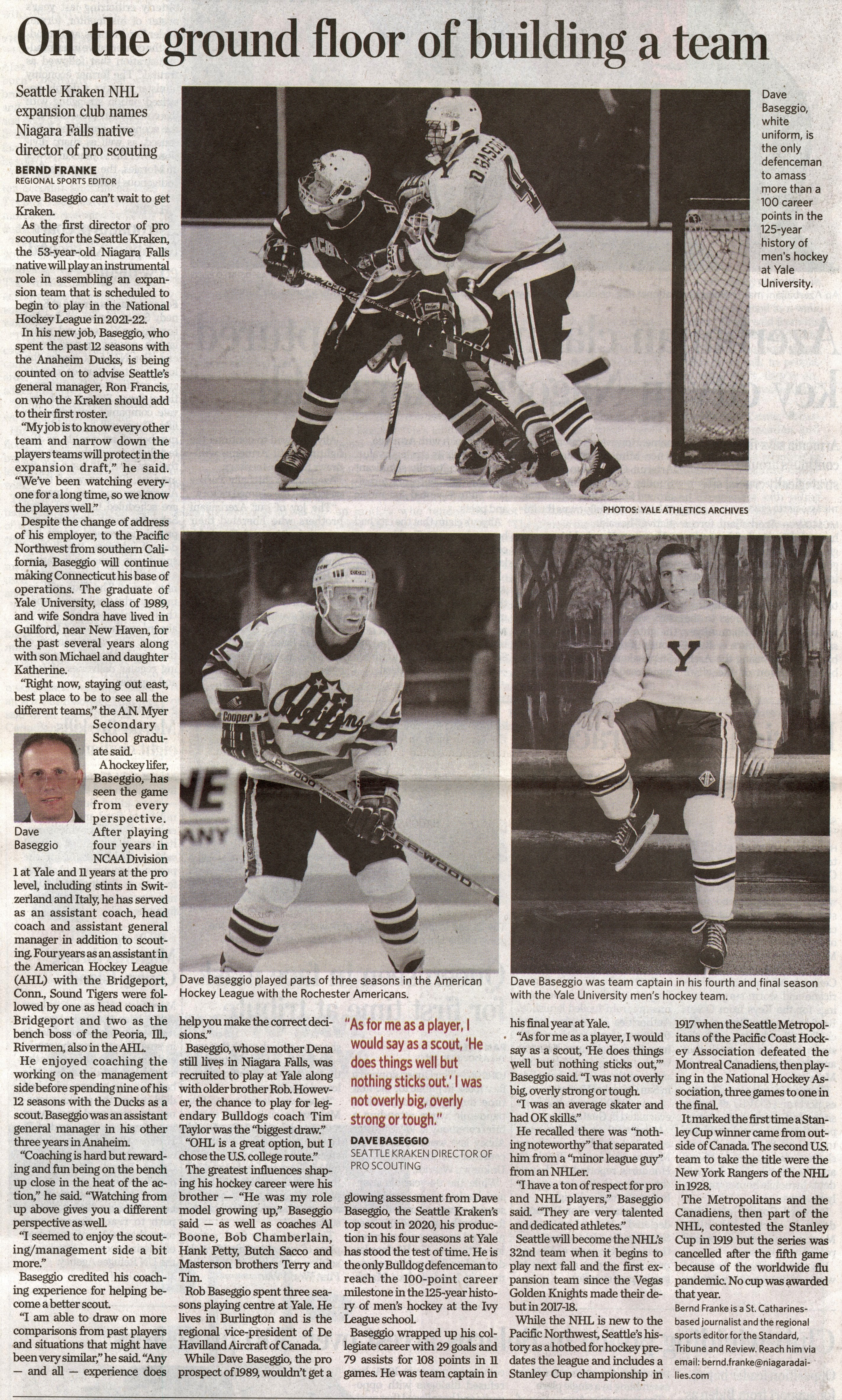 On the ground floor of building a team : Seattle Kraken NHL expansion club names Niagara Falls native director of pro scouting