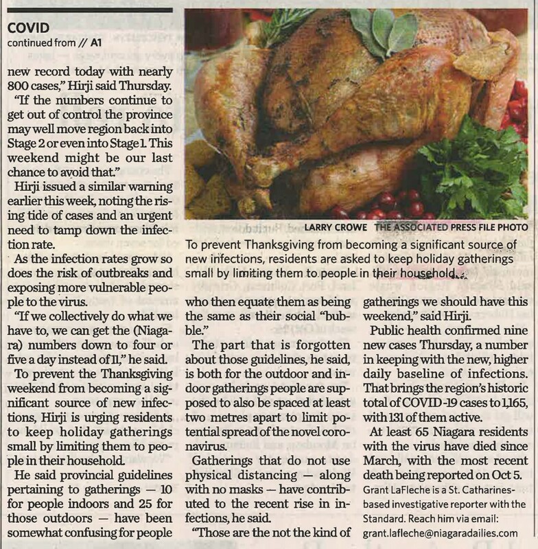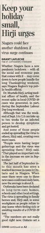 - Keep your holiday small, Hirji urges : Niagara could face another shutdown if virus surge continues
