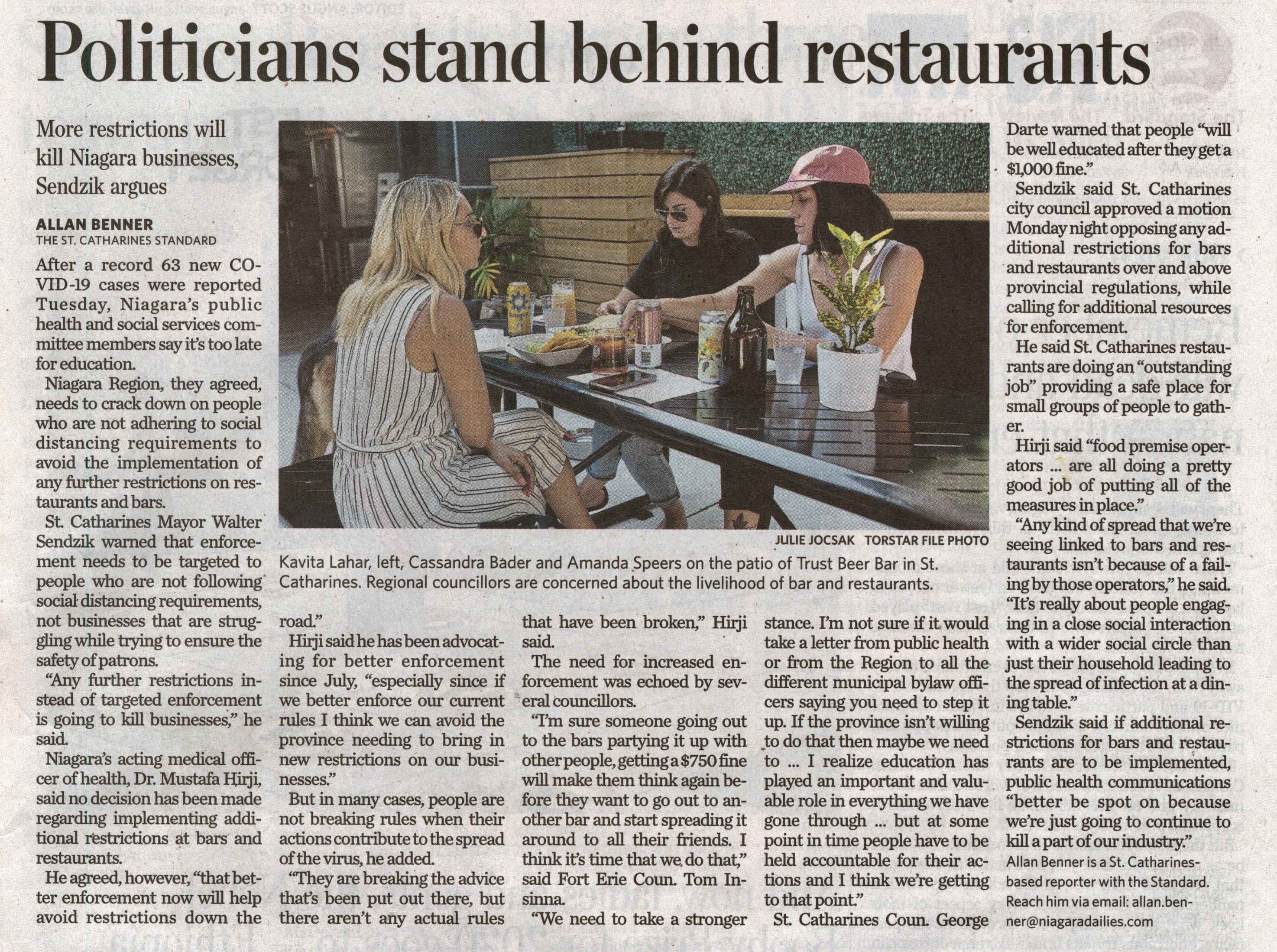 - Politicians stand behind restaurants : More restrictions will kill Niagara businesses, Sendzik argues
