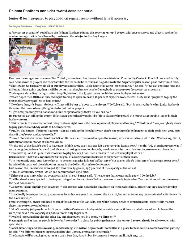 - Pelham Panthers consider 'worst-case scenario' : Junior-B team prepared to play 2020-21 regular season without fans if necessary