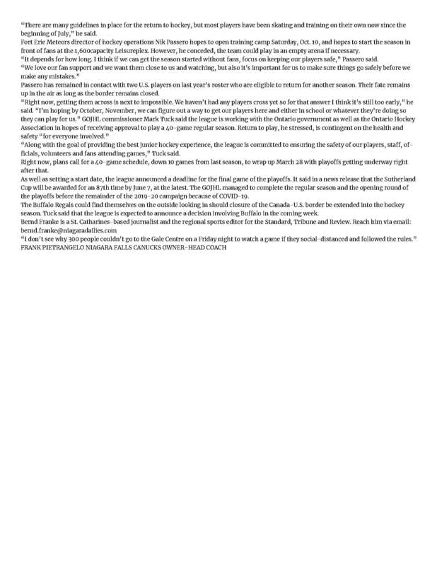 - Pietrangelo, Frank / Greater Ontario Junior Hockey League / Golden Horseshoe Conference / Gale Centre / Toffolo, Tim / Barnes, Scott / Niagara Falls Canucks / Pelham Panthers / Thorold Blackhawks / COVID-19 pandemic / social distancing