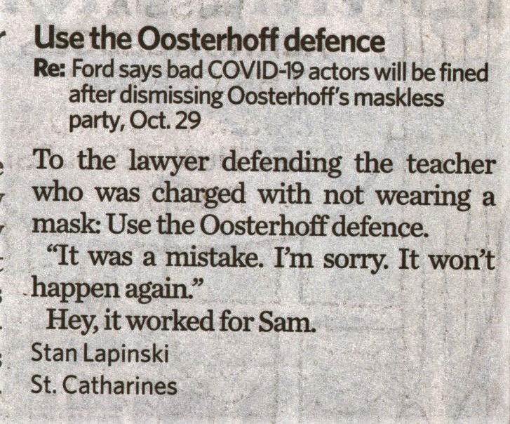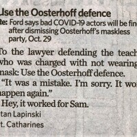 - Use the Oosterhoff defence : Re: Ford says bad COVID-19 actors will be fined after dismissing Oosterhoff's maskless party, Oct. 29