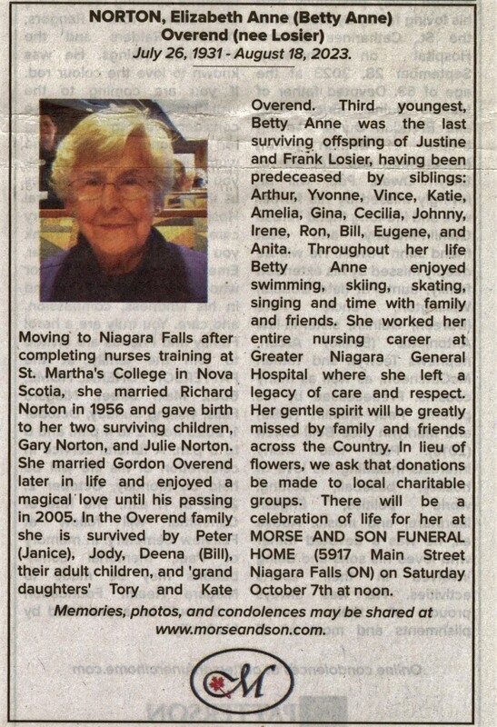 - Norton, Elizabeth Anne (Betty Anne) (Overend) (nee Losier)