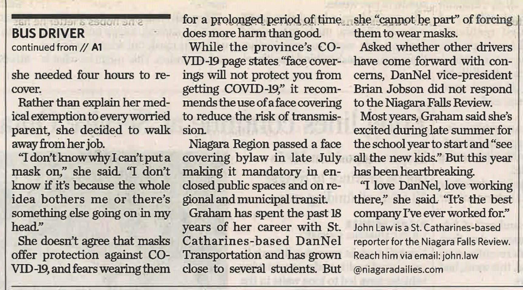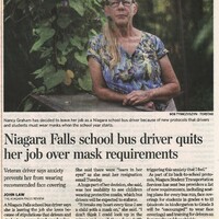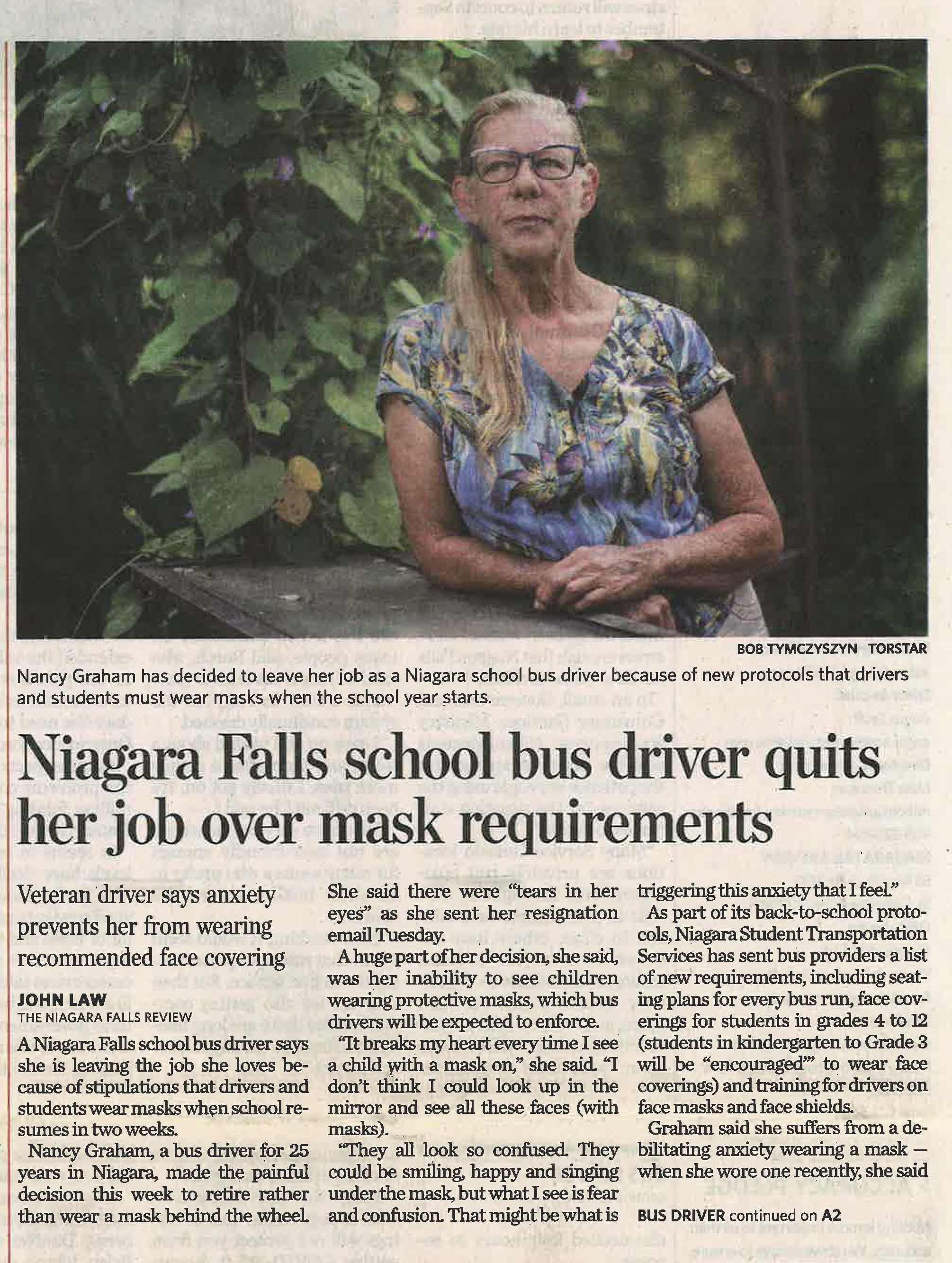 - Niagara Falls school bus driver quits her job over mask requirements : Veteran driver says anxiety prevents her from wearing recommended face covering