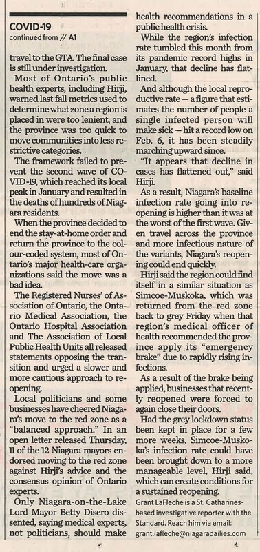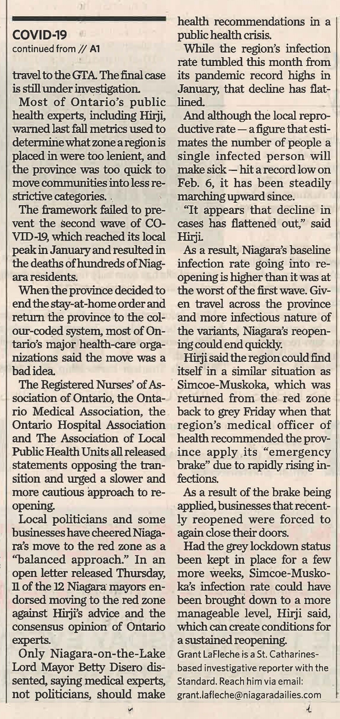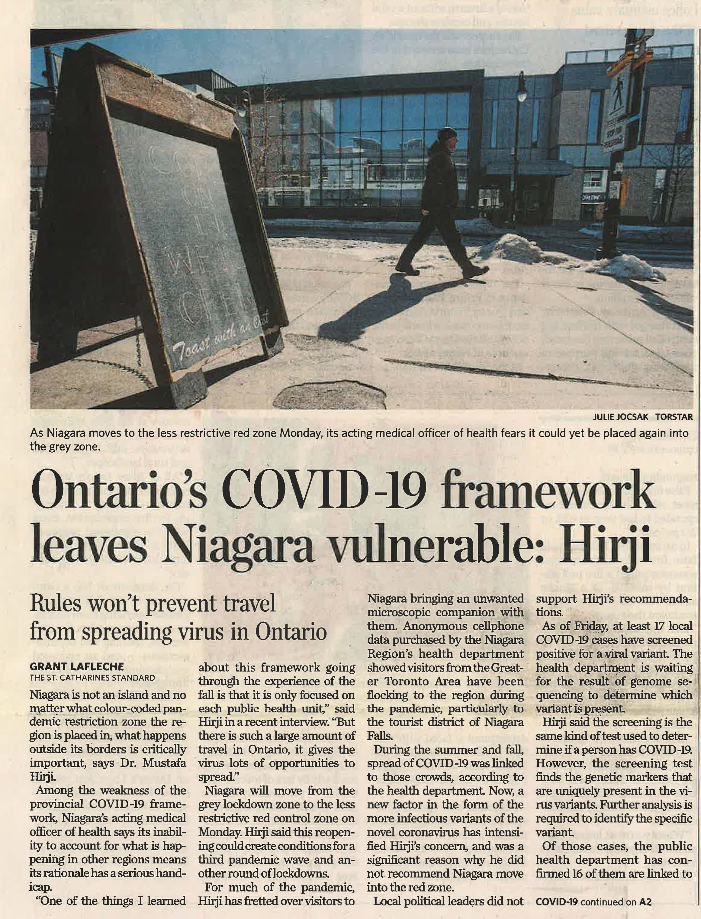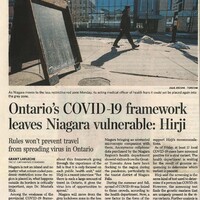- Ontario's COVID-19 framework leaves Niagara vulnerable : Hirji : Rules won't prevent travel from spreading virus in Ontario