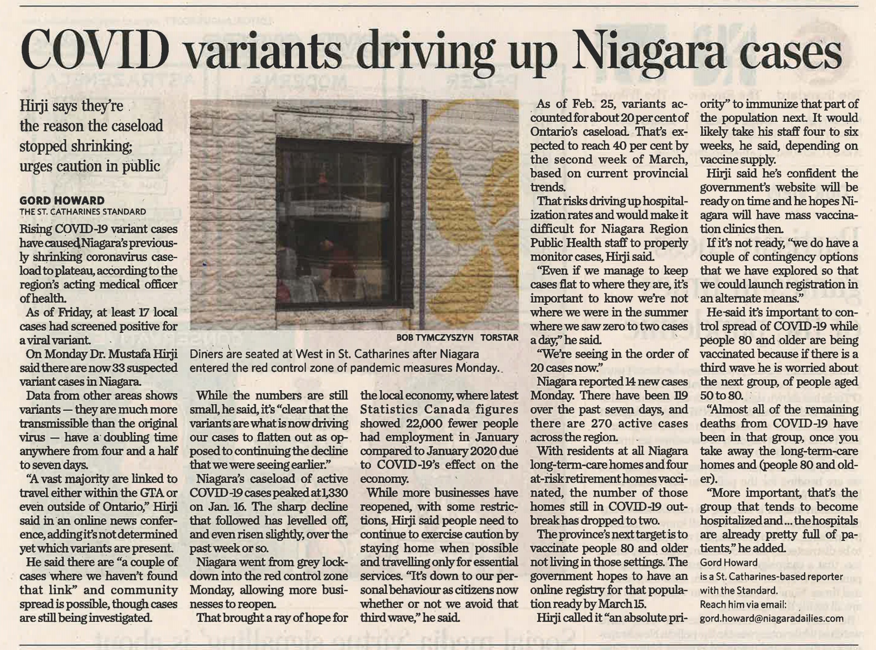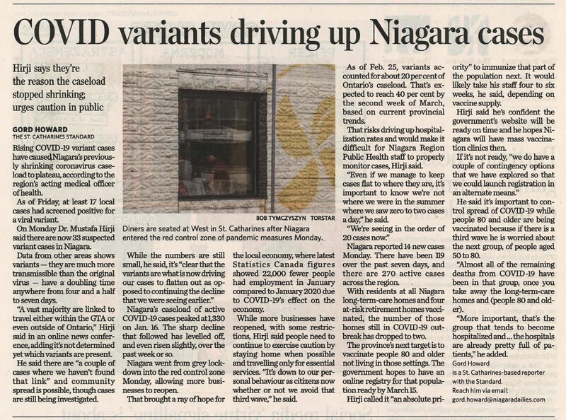- COVID variants driving up Niagara cases : Hirji says they're the reason the caseload stopped shrinking; urges caution in public
