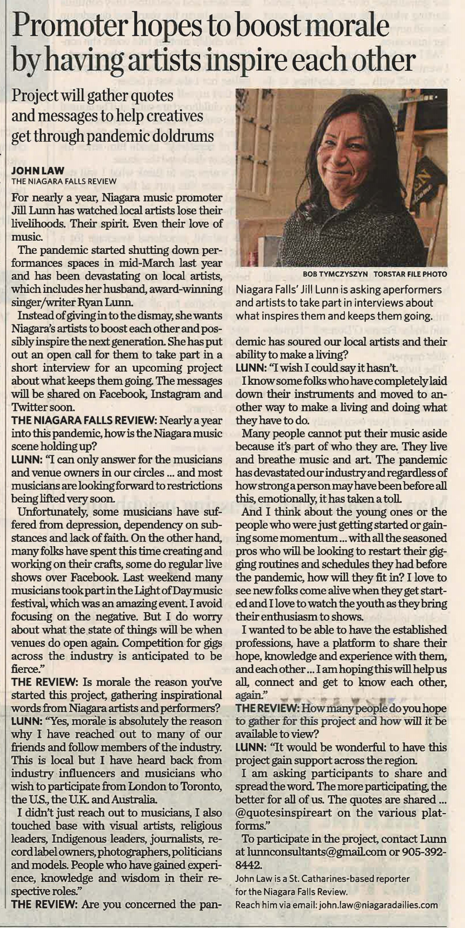 - Promotor hopes to boost morale by having artists inspire each other : Project will gather quotes and messages to help creatives get through pandemic doldrums