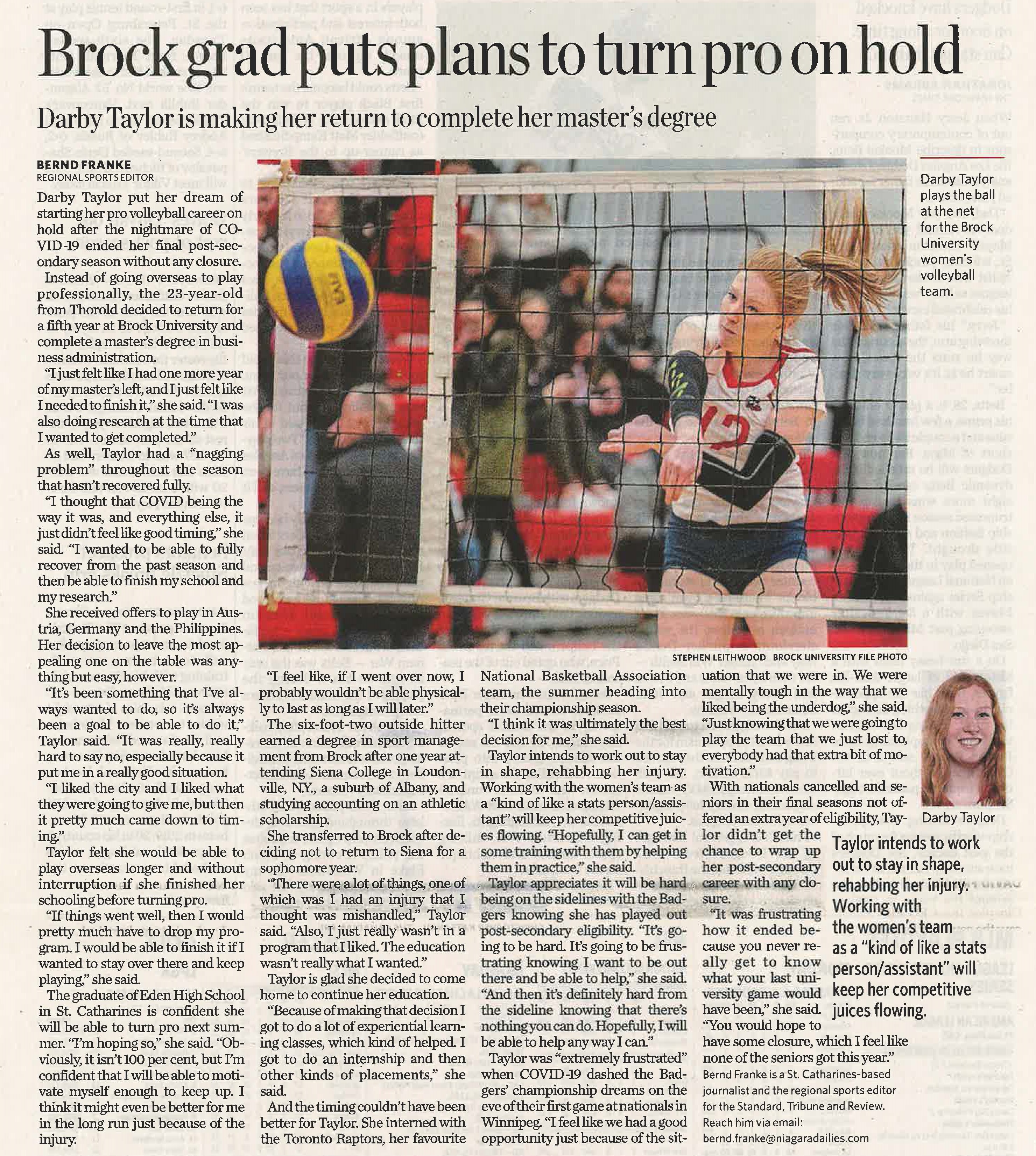 - Brock grad puts plans to turn pro on hold : Darby Taylor is making her return to complete her master's degree