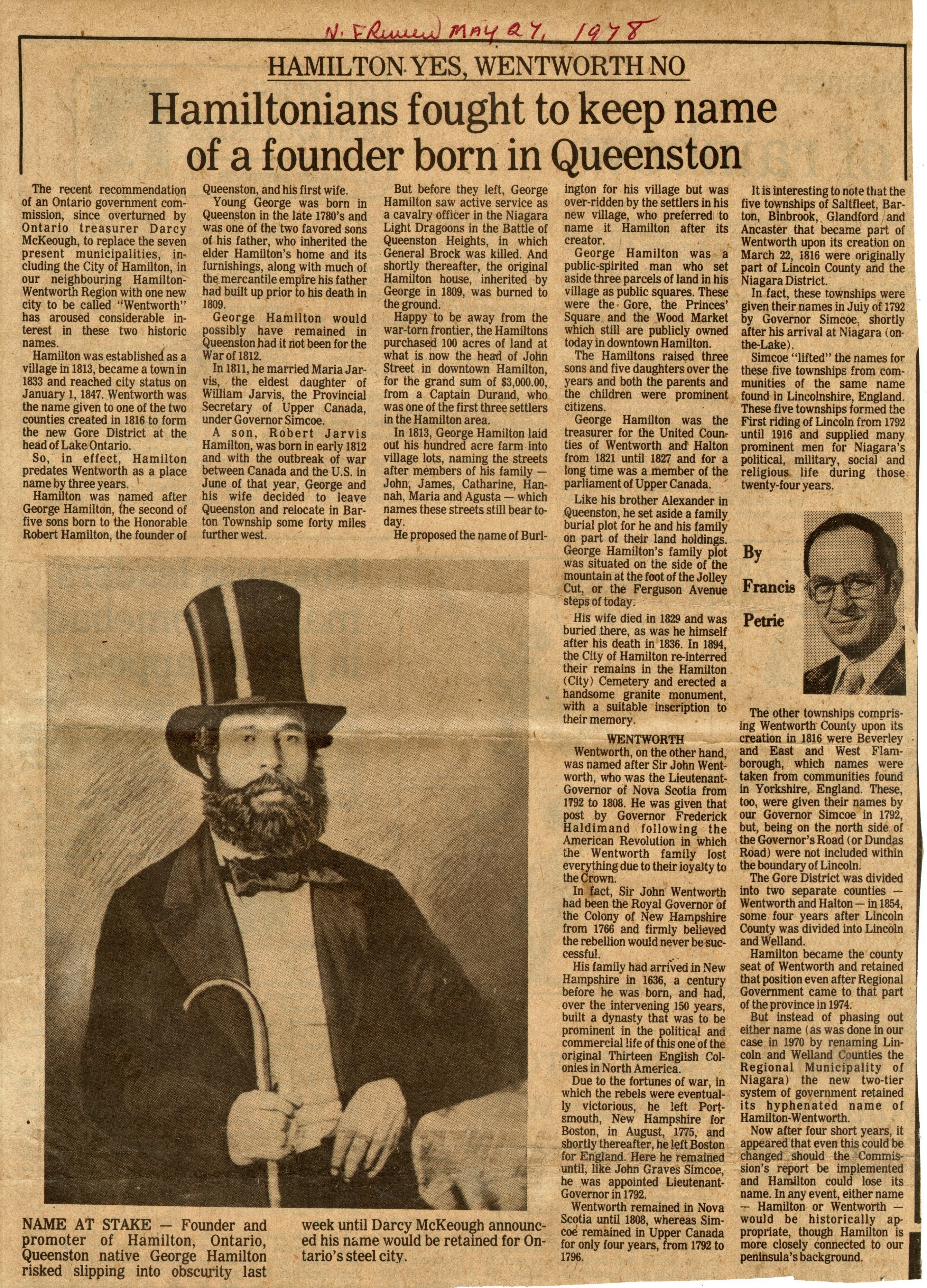 - Hamilton Yes, Wentworth No : Hamiltonians fought to keep name of a founder born in Queenston