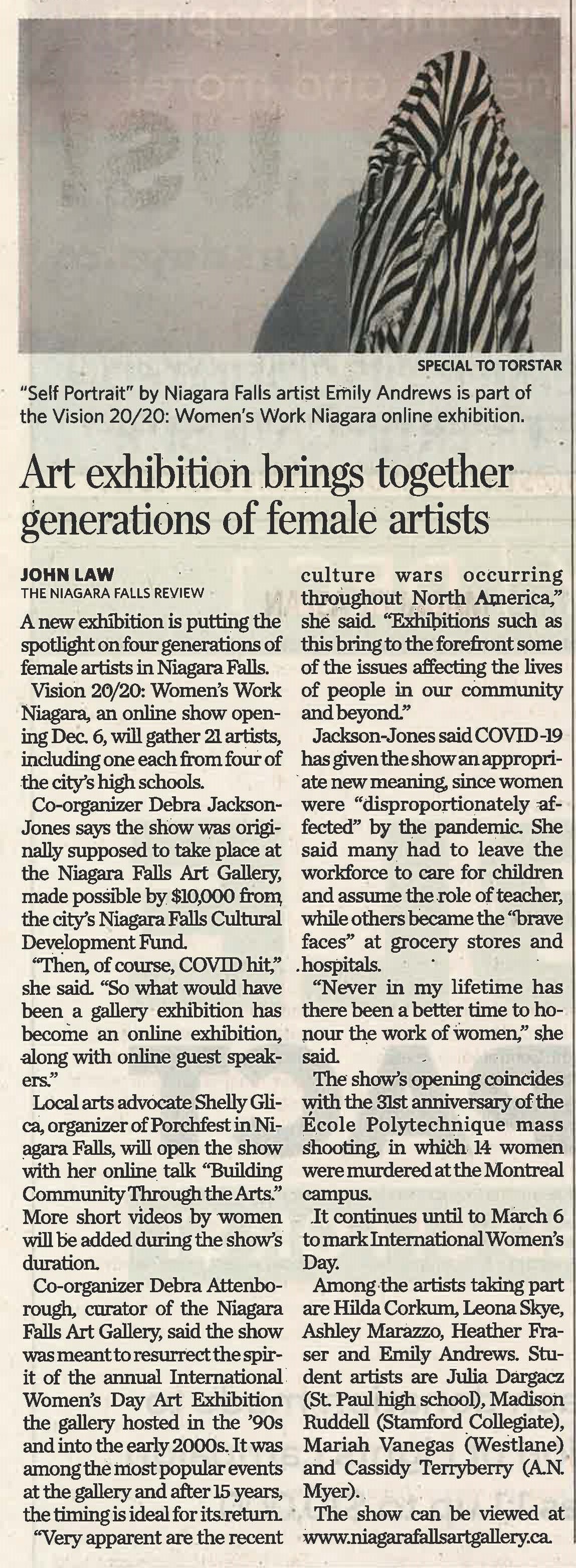 - Andrews, Emily / "Self Portrait" / Vision 20/20: Women's Work Niagara / Jackson-Jones, Debra / Niagara Falls Art Gallery / Niagara Falls Cultural Development Fund / COVID-19 pandemic / Glica, Shelly / Porchfests in Niagara / Attenborough, Debra