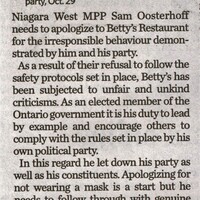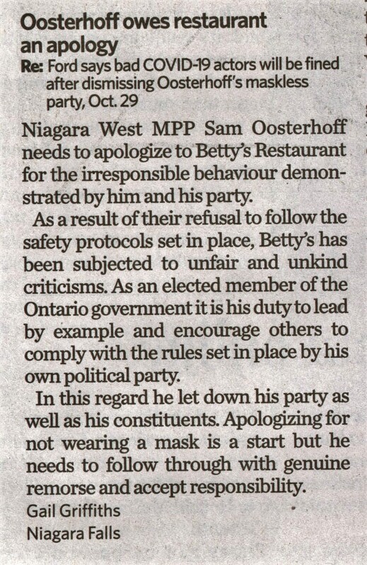 Oosterhoff owes restaurant an apology : Re: Ford says bad COVID-19 actors will be fined after dismissing Oosterhoff's maskless party, Oct. 29