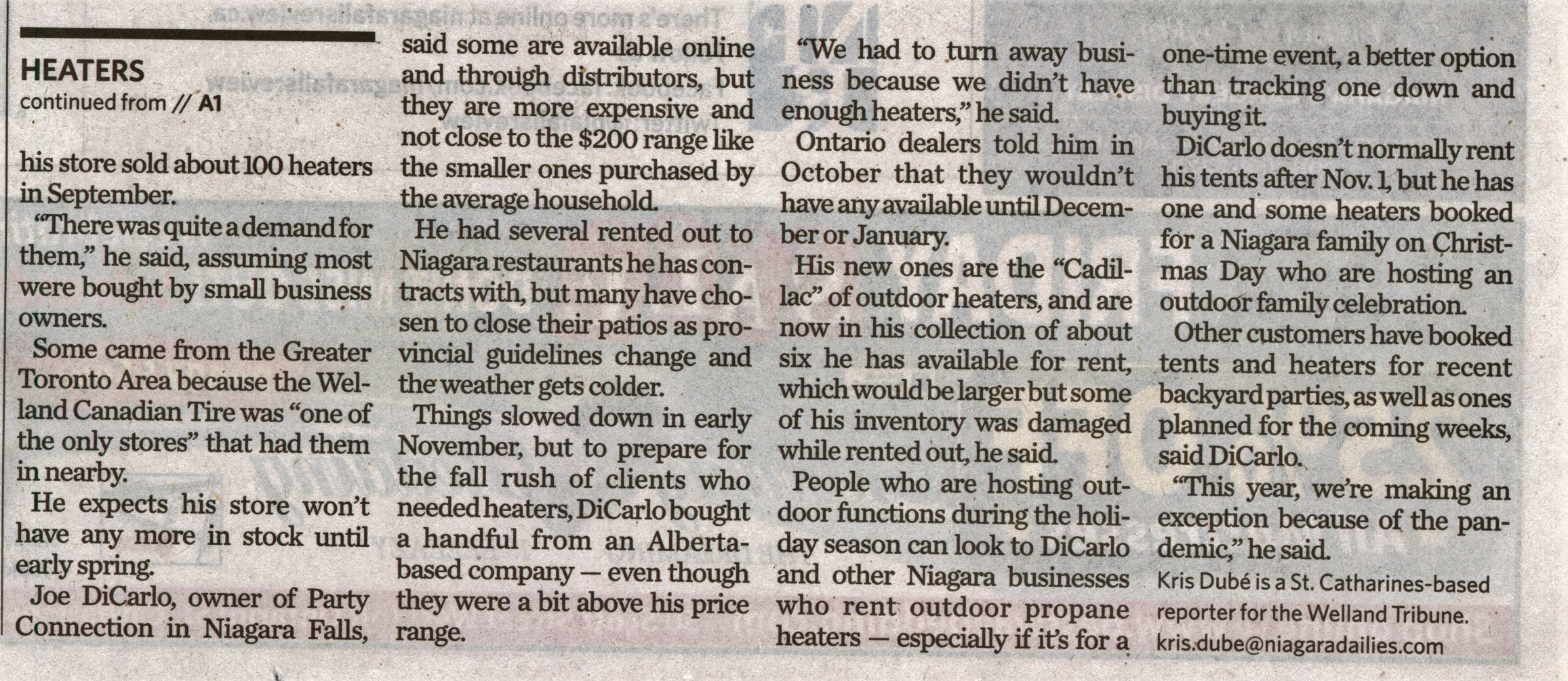 - DiCarlo, Joe / Party Connection / tent rentals / propane heater shortage / COVID-19 pandemic