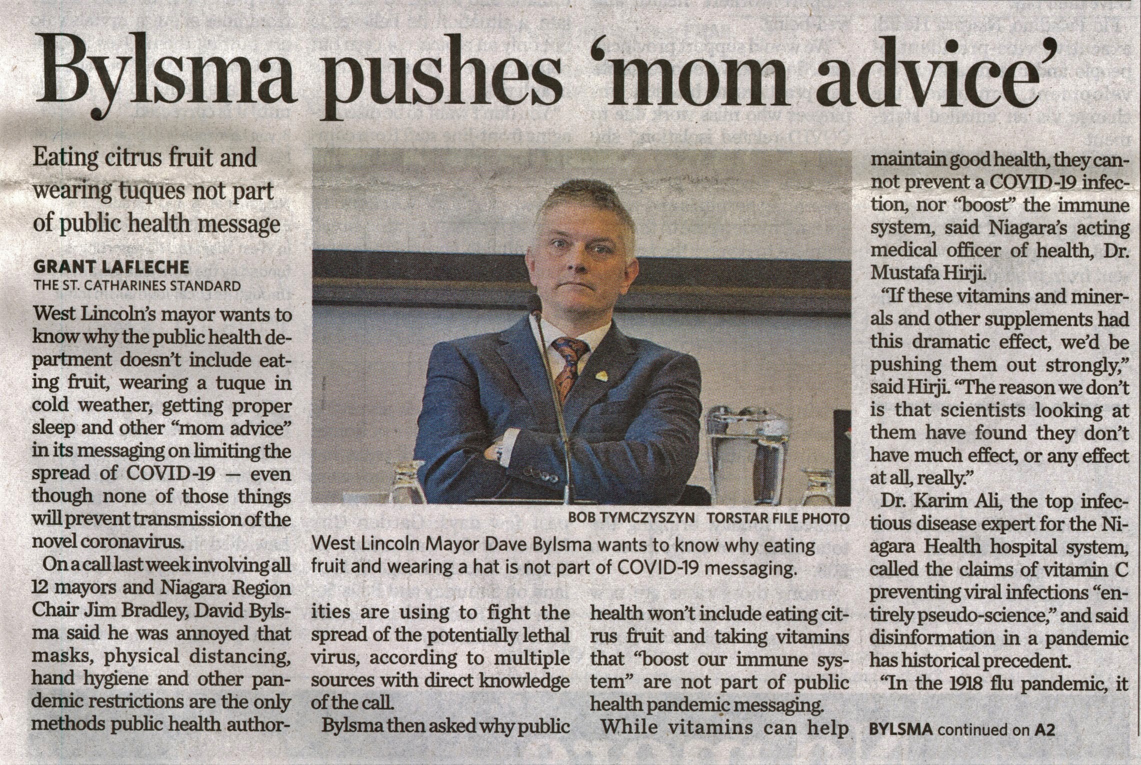 - Bylsma pushes 'mom advice' : Eating citrus fruit and wearing tuques not part of public health message