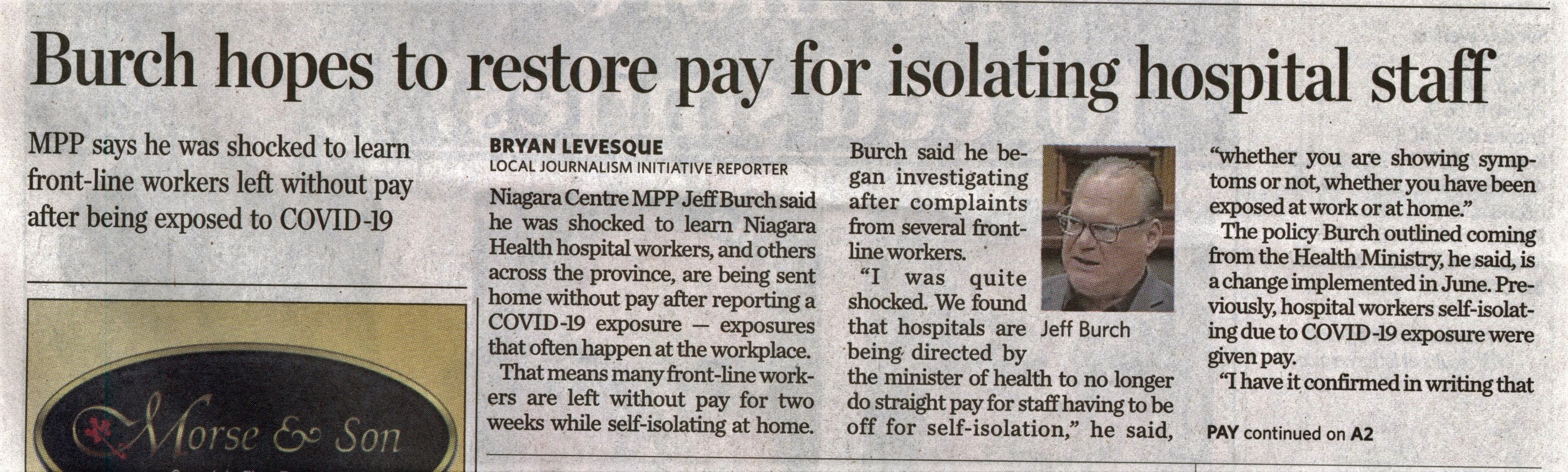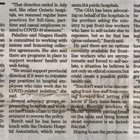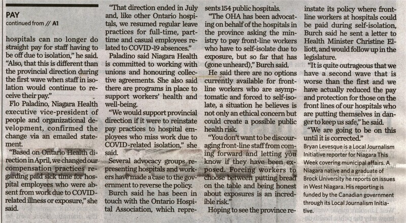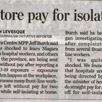 - Burch hopes to restore pay for isolating hospital staff : MPP says he was shocked to learn front-line workers left without pay after being exposed to COVID-19
