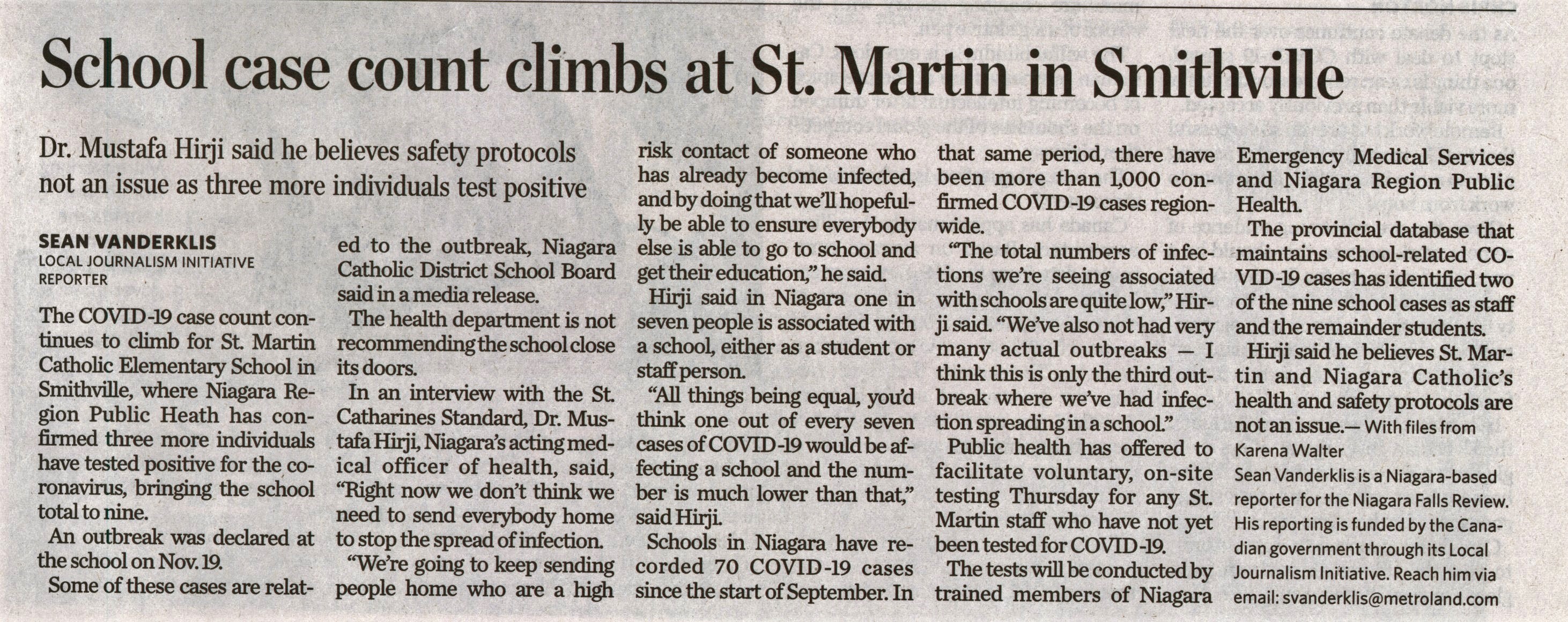 - School case count climbs at St. Martin in Smithville : Dr. Mustafa Hirji says he believes safety protocols not an issue as three more individuals test positive