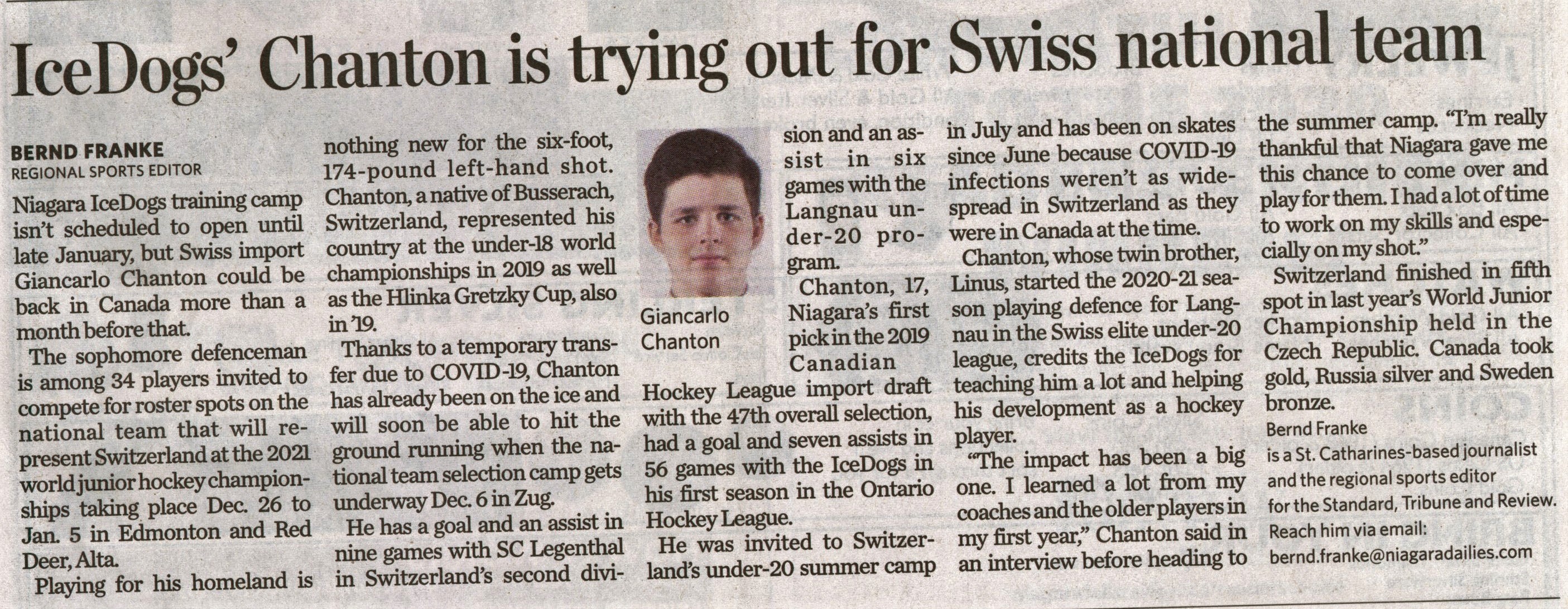 - Chanton, Giancarlo / Niagara IceDogs / COVID-19 pandemic / Switzerland
