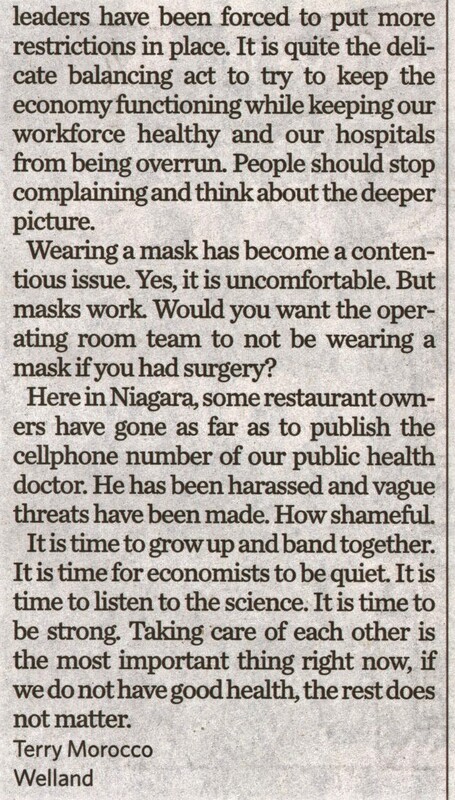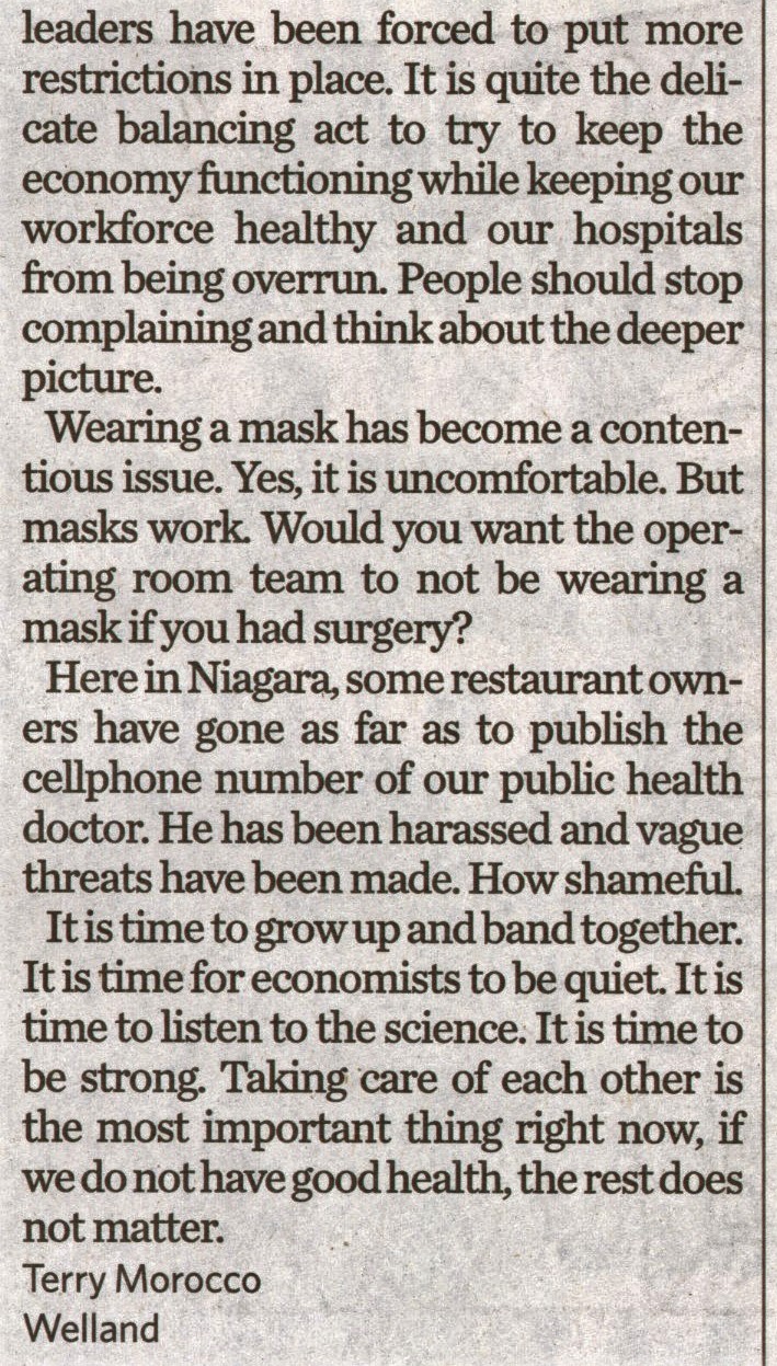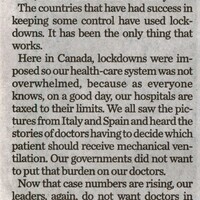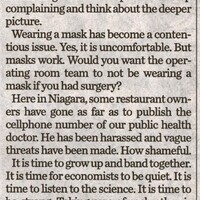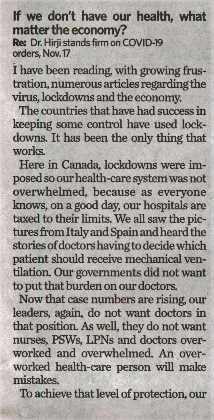 - If we don't have our health, what matter the economy? Re: Dr. Hirji stands firm on COVID-19 orders, Nov. 17