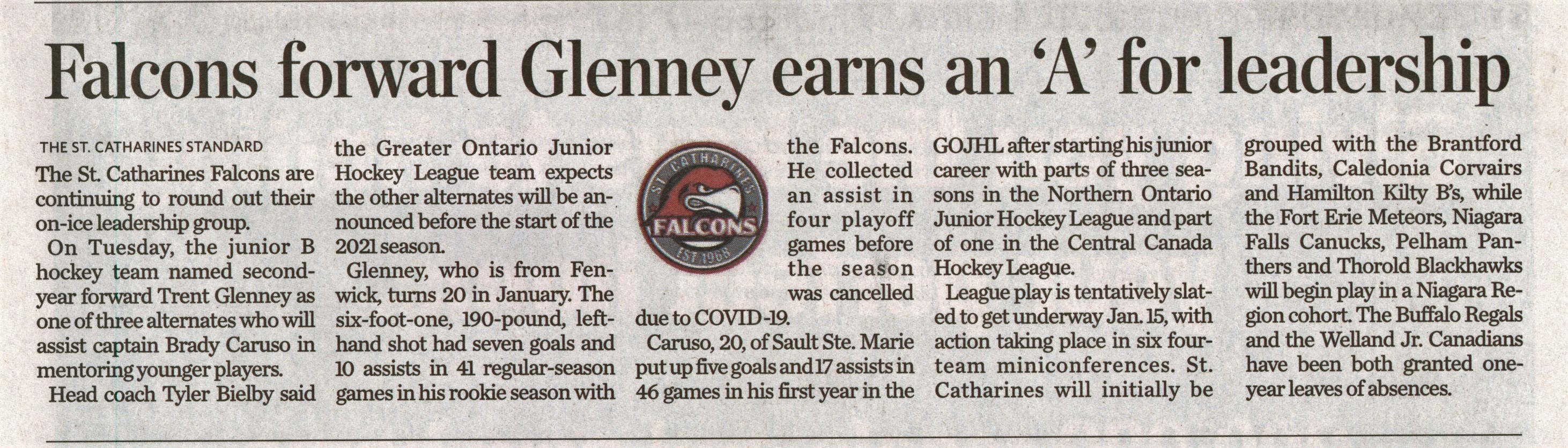 - Falcons forward Glenney earns for 'A' for leadership