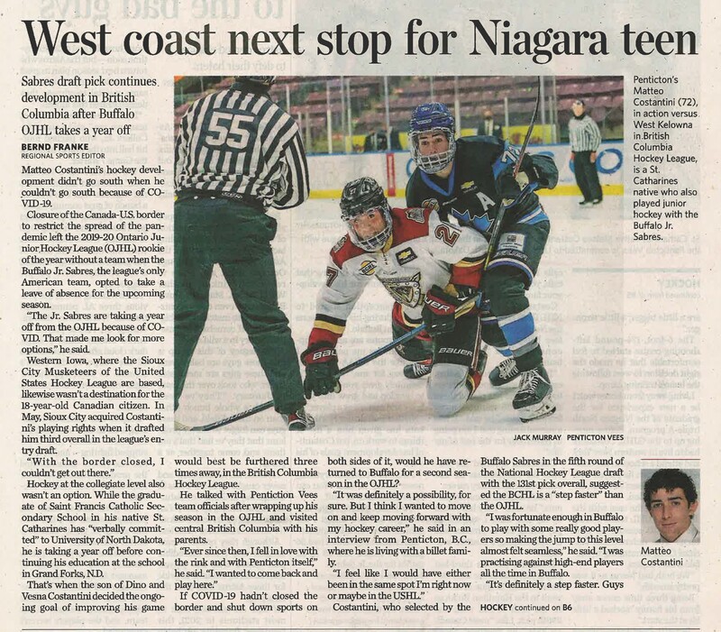- West coast next stop for Niagara teen : Sabres draft pick continues development in British Columbia after Buffalo OJHL takes a year off