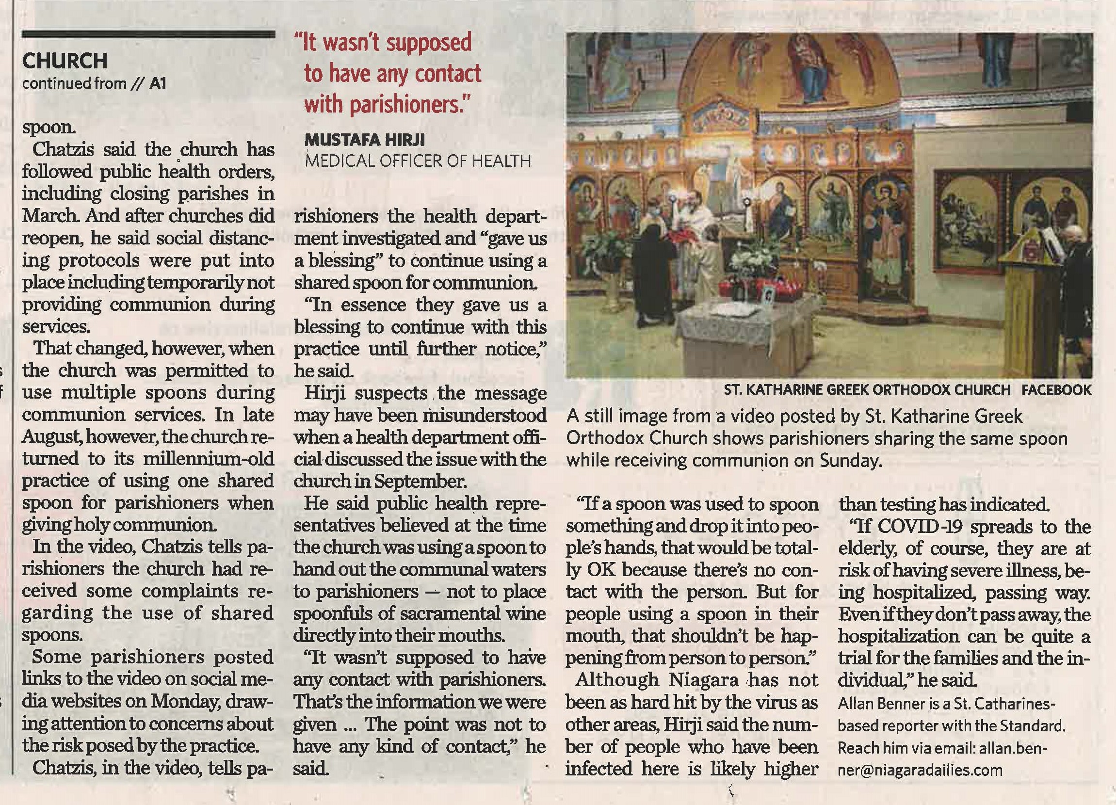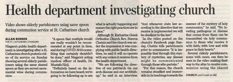 - Health department investigating church : video shows elderly parishioners using same spoon during communion service at St. Catharines church