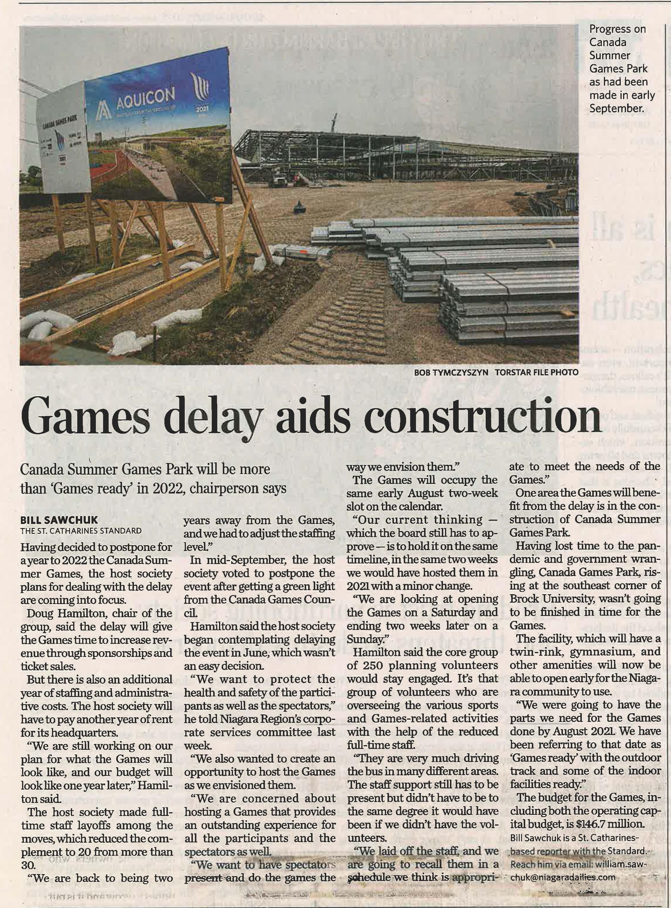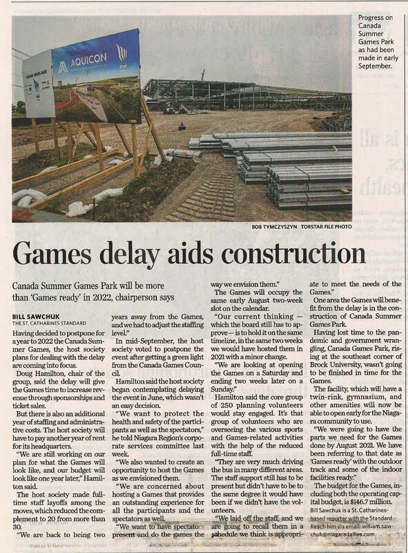- Games delay aids construction : Canada Summer Games Park will be more than Games ready in 2022, chairperson says