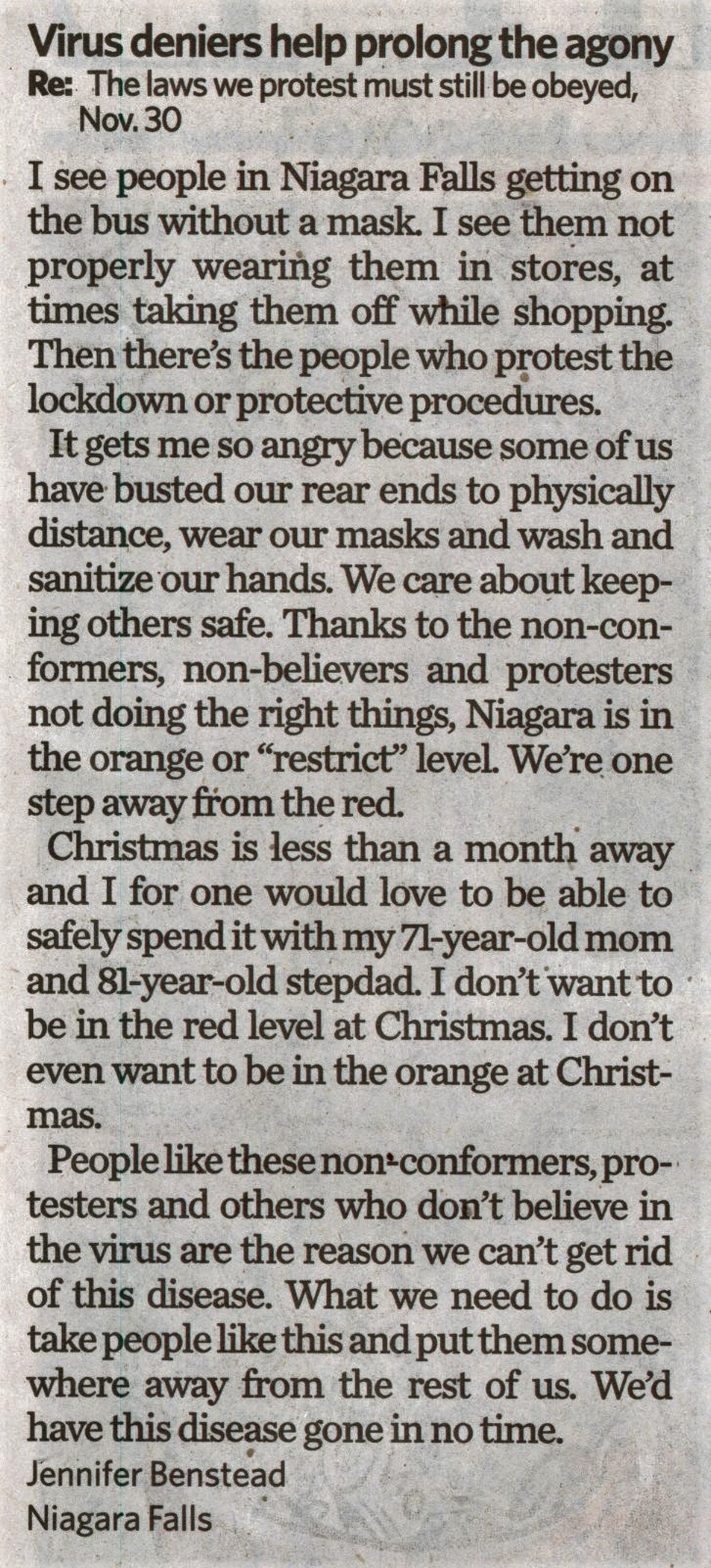 - Virus deniers help prolong the agony : Re: The laws we protest must still be obeyed, Nov. 30