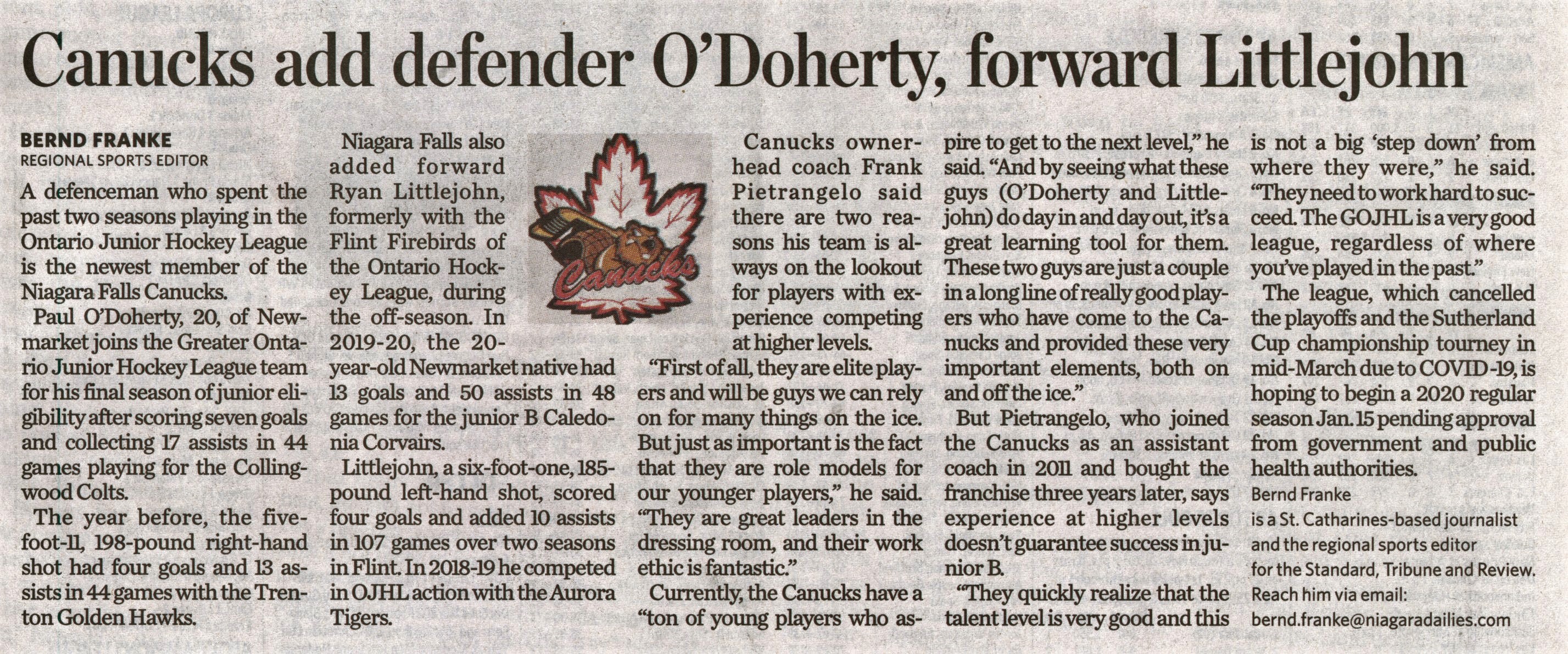 - O'Doherty, Paul / Littlejohn, Ryan / Niagara Falls Canucks / COVID-19 pandemic