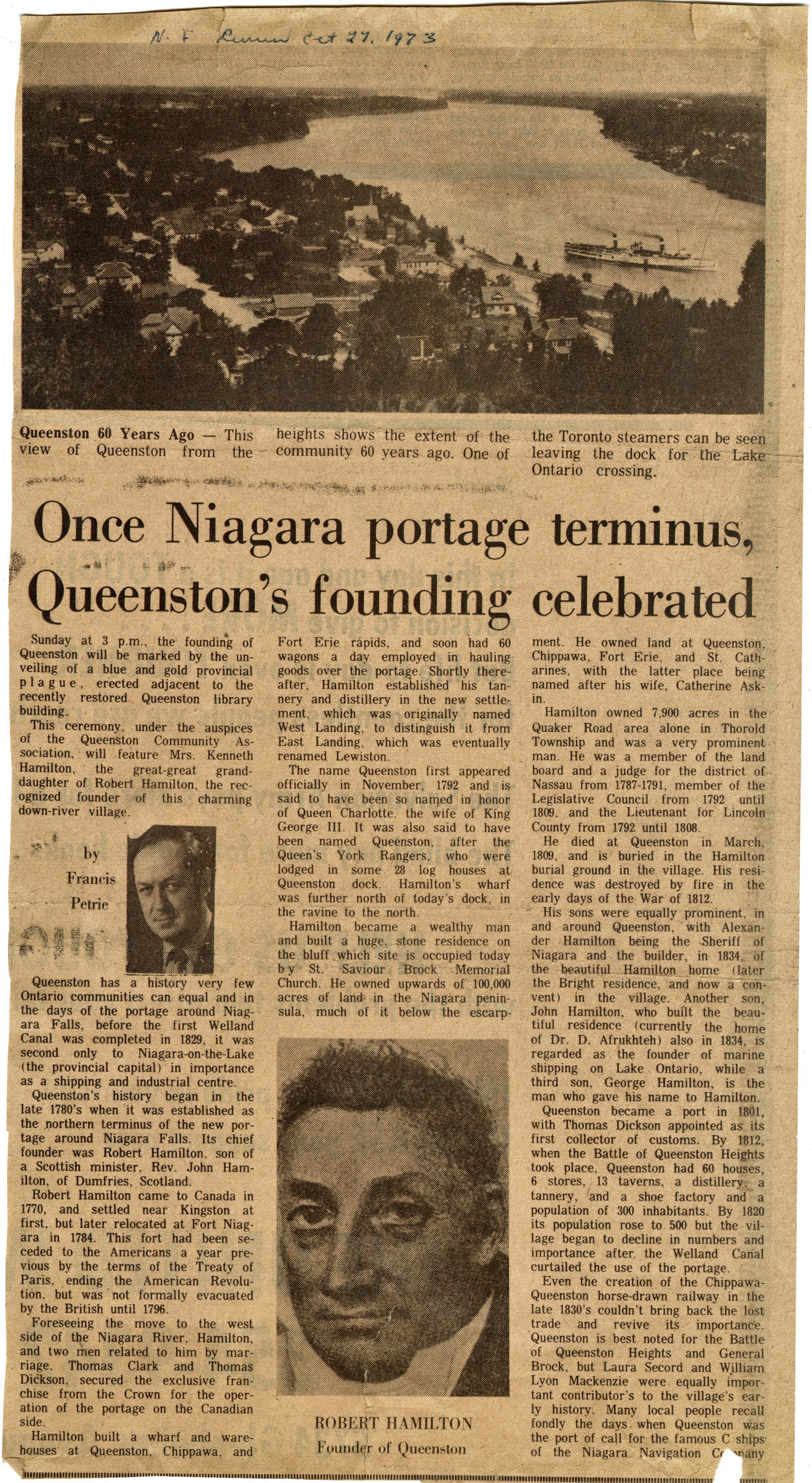 - Once Niagara portage terminus, Queenston's founding celebrated