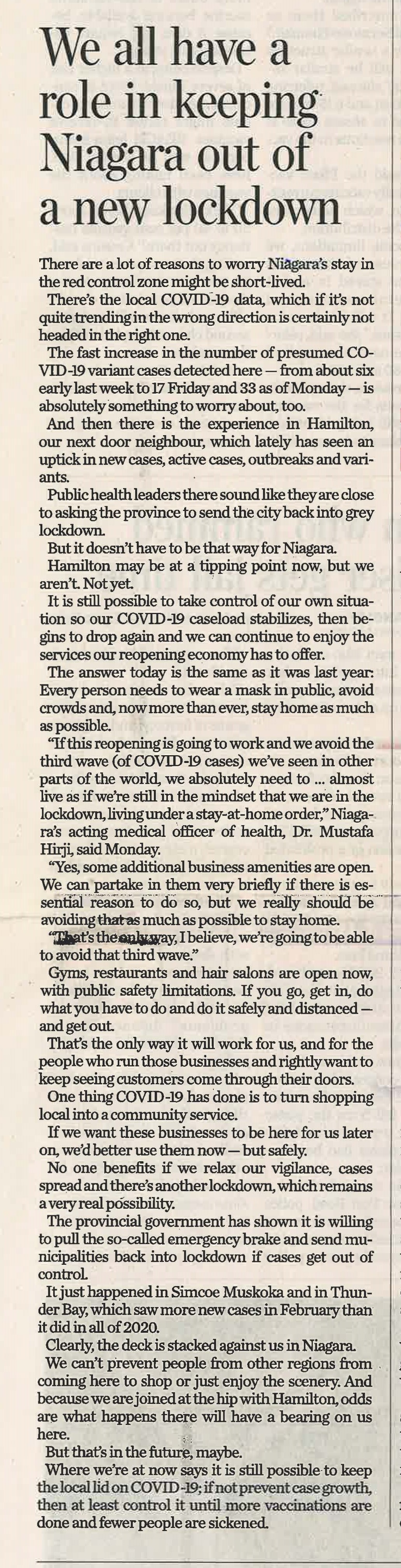 - We all have a role in keeping Niagara out of a new lockdown