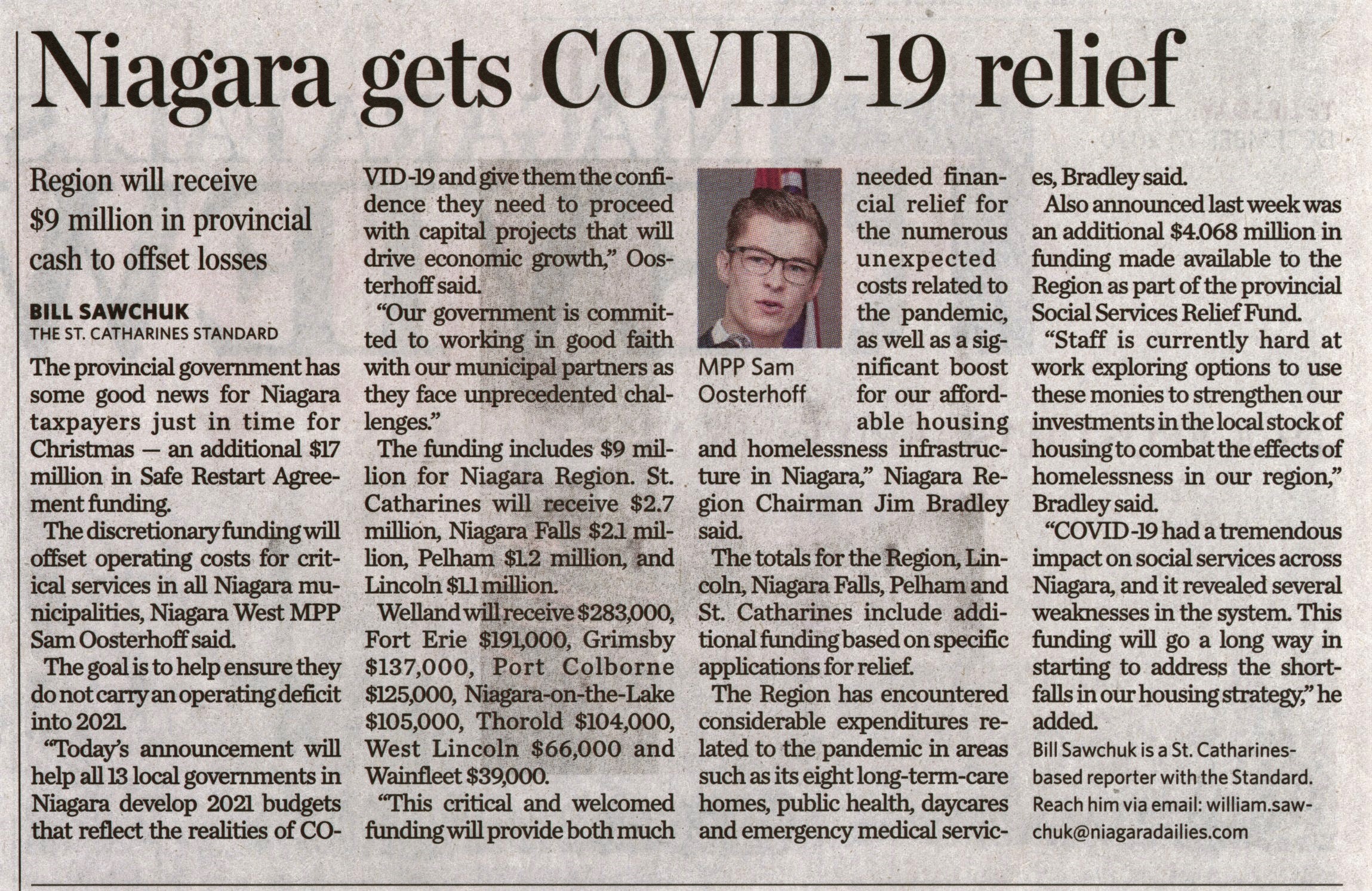- Niagara gets COVID-19 relief : Region will receive $9 million in cash to offset losses