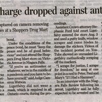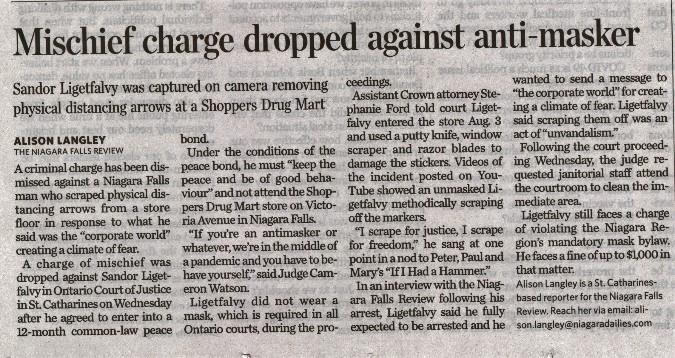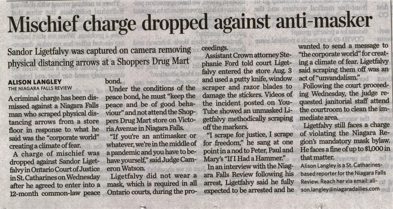 - Mischief charge dropped against anti-masker : Sandor Ligetfalvy was captured on camera removing physical distancing arrows at a Shoppers Drug Mart