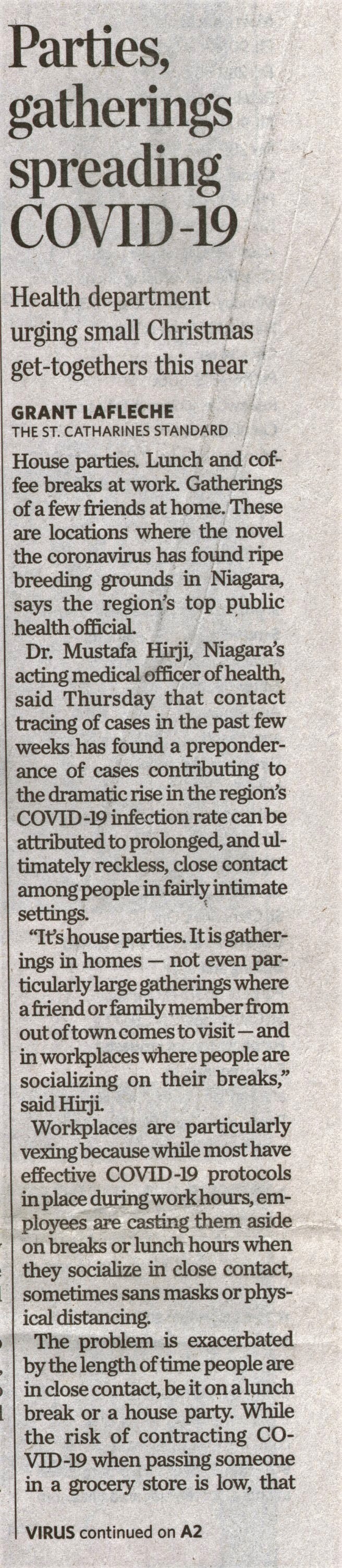 - Parties, gatherings spreading COVID-19 : Health department urging small Christmas get-togethers this near