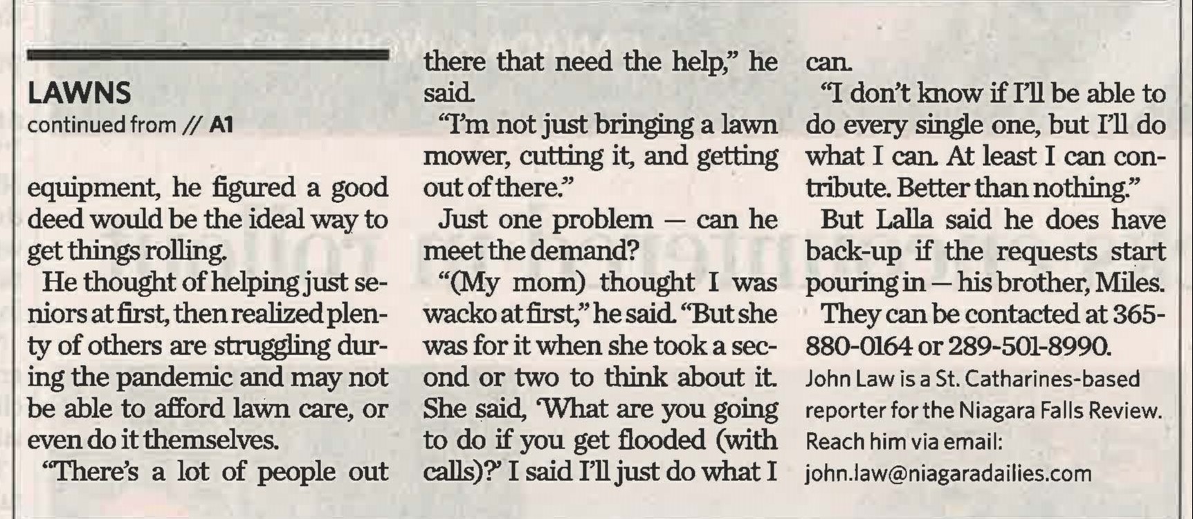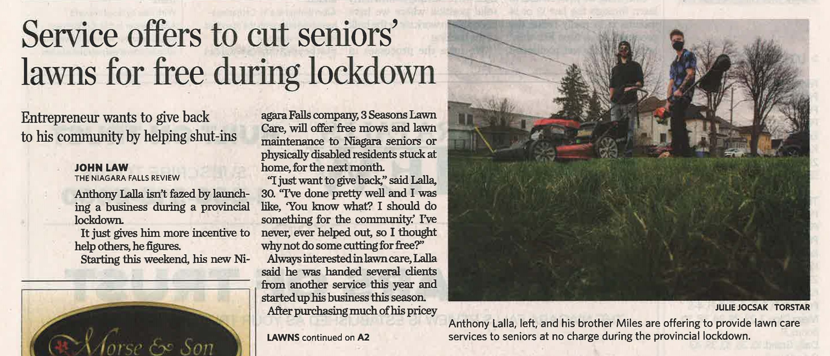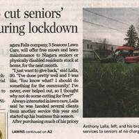 - Service offers to cut seniors' lawns for free during lockdown : Entrepreneur wants to give back to his community by helping shut-ins