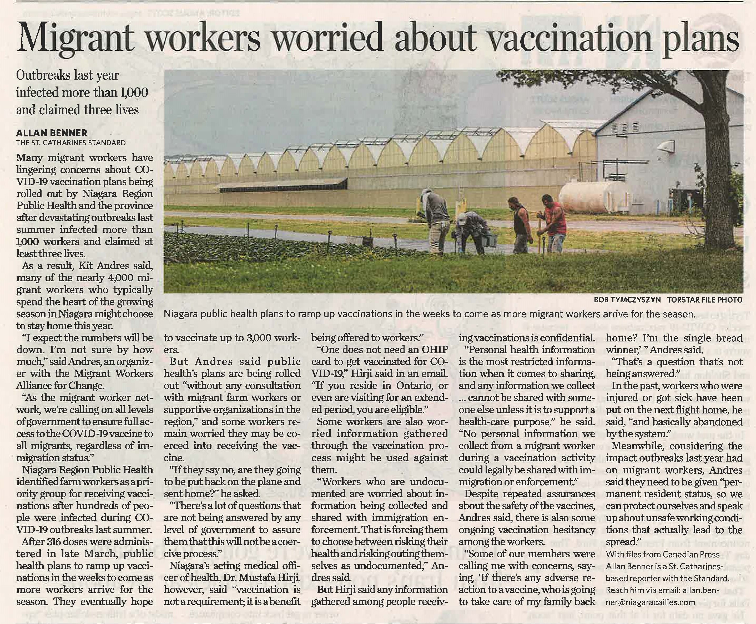 - COVID-19 pandemic / vaccinations / Niagara Regional Public Health / Andres, Kit / Migrant Workers Alliance for Change / Hirji, Mustafa Dr.