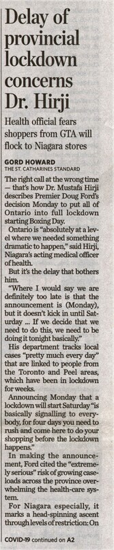 - Delay of provincial lockdown concerns Dr. Hirji : Health official fears shoppers from GTA will flock to Niagara stores
