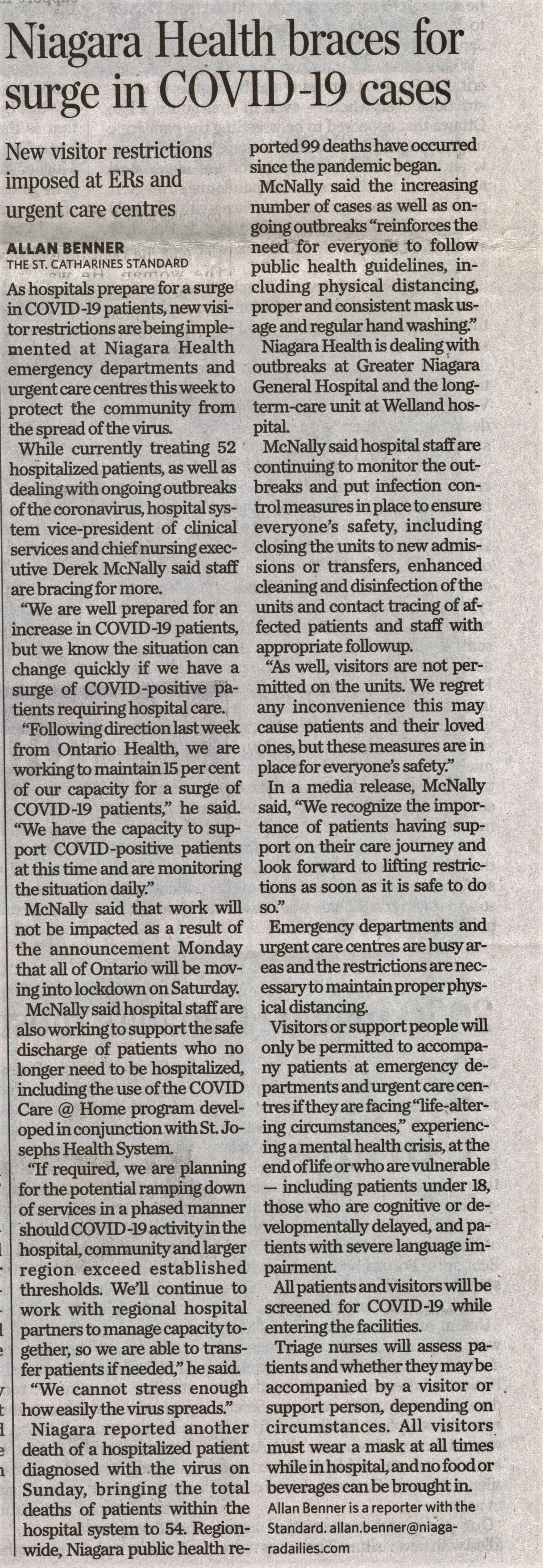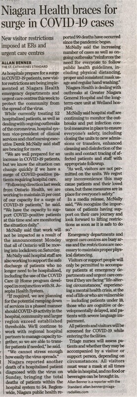 - Niagara Health braces for surge in COVID-19 cases : New visitor restrictions imposed at ERs and urgent care centres