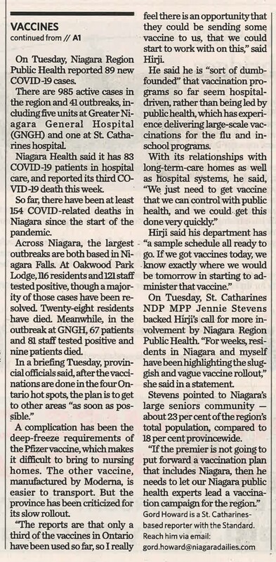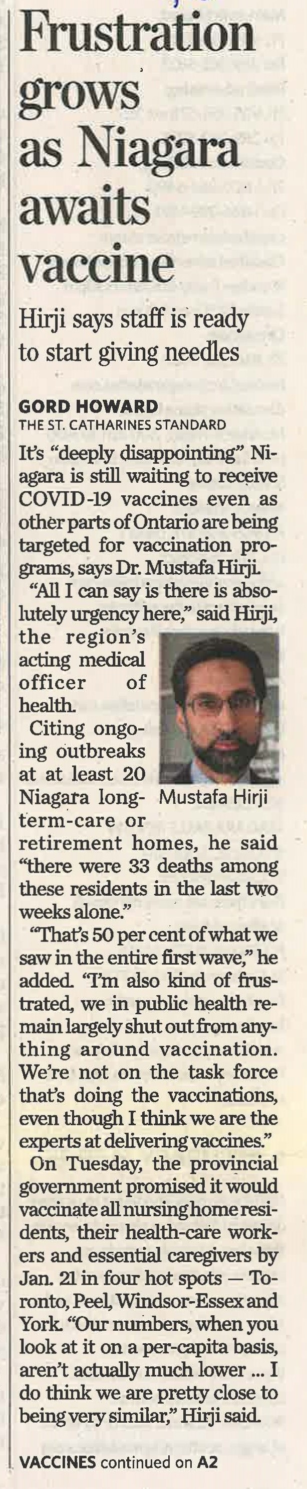 - Frustation grows as Niagara awaits vaccine : Hirji says staff is ready to start giving needles