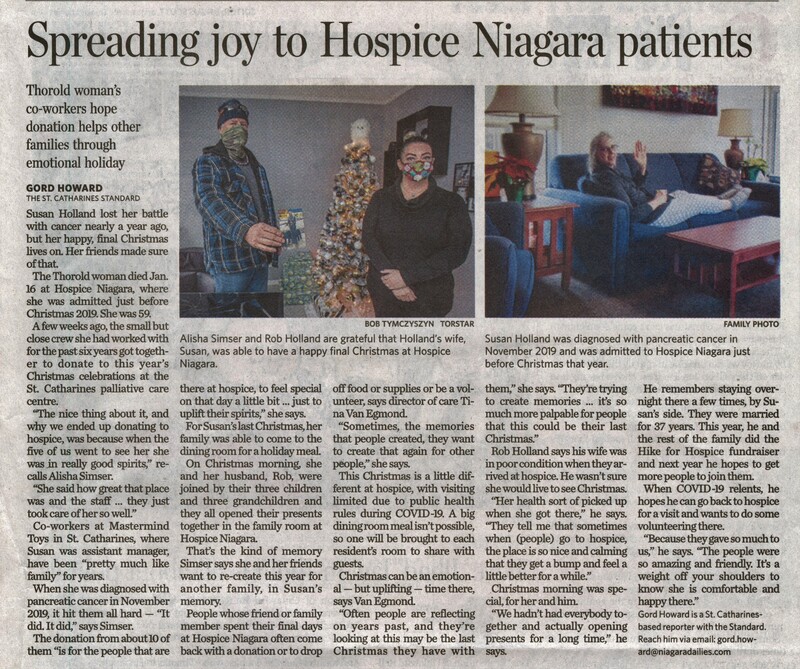 - Spreading joy to Hospice Niagara Patients : Thorold woman's co-workers donation helps other families through emotional holiday