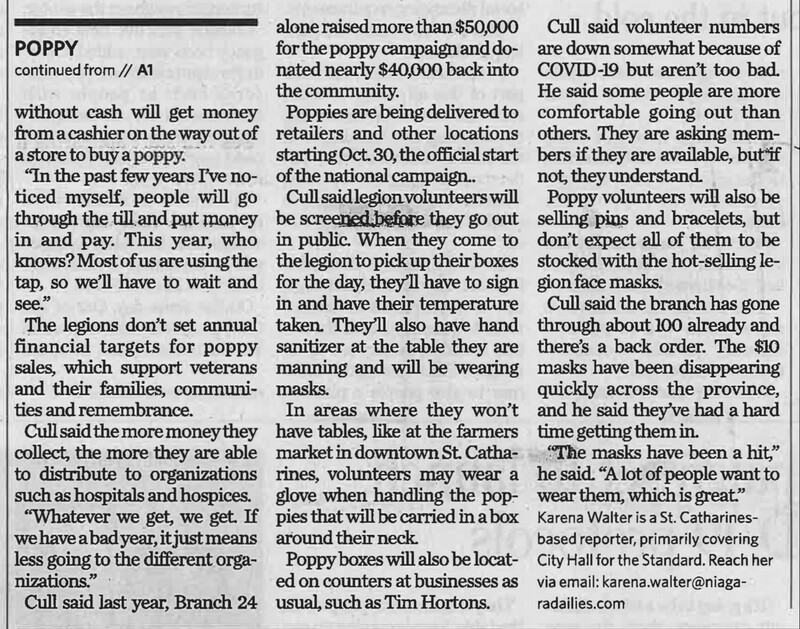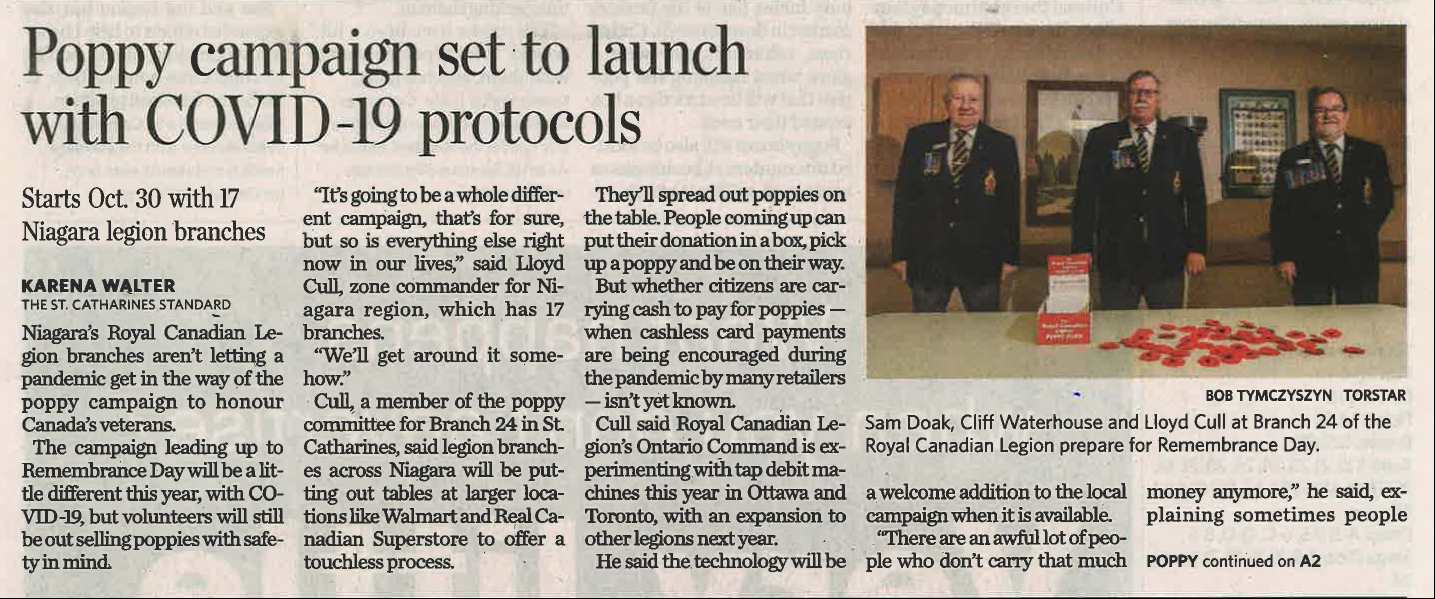 - Poppy campaign set to launch with COVID-19 protocols : starts Oct. 30 with 17 Niagara Legion branches