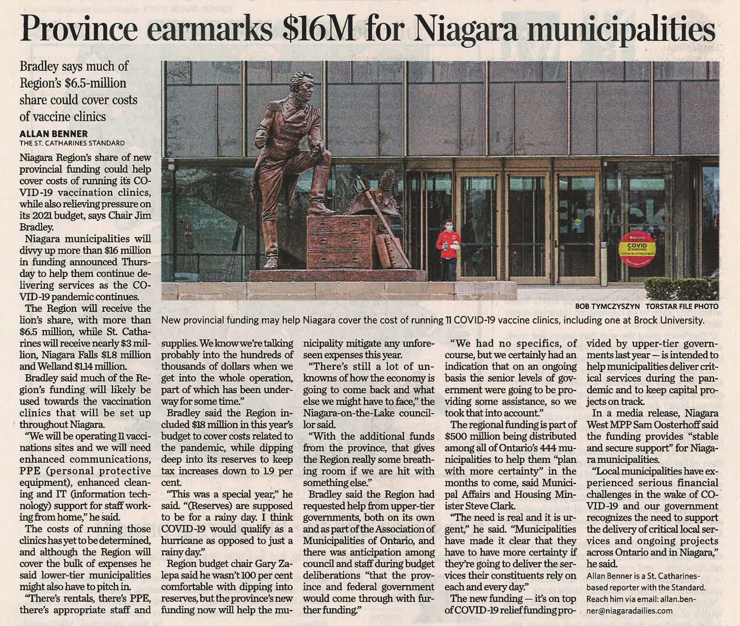 - Province earmarks $16M for Niagara municipalities : Bradley says much of Region's $6.5-million share could cover costs of vaccine clinics