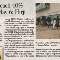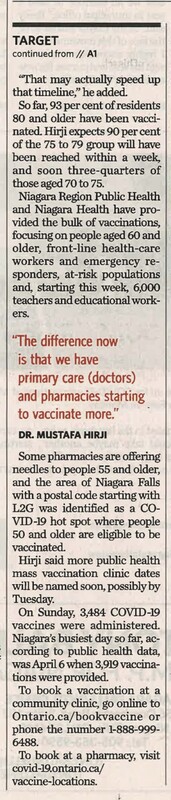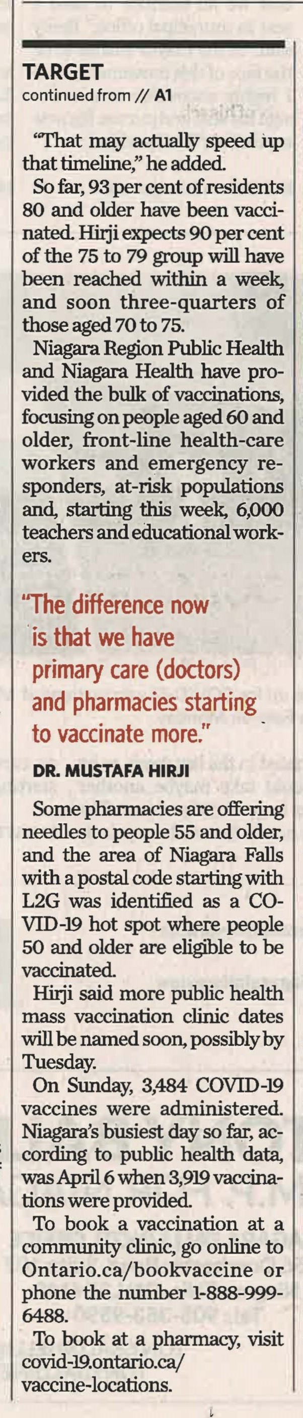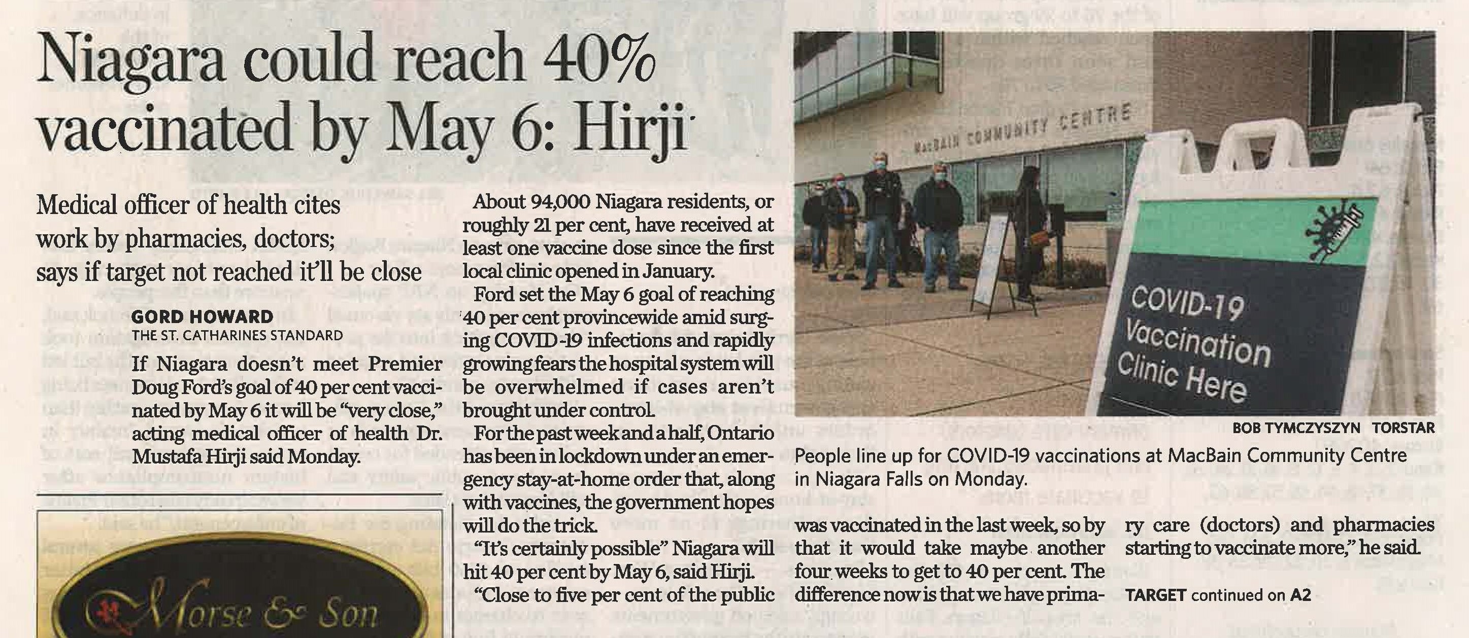 - Niagara could reach 40% vaccinated by May 6: Hirji : Medical officer of health cites work by pharmacies, doctors; says if target not reached it'll be close