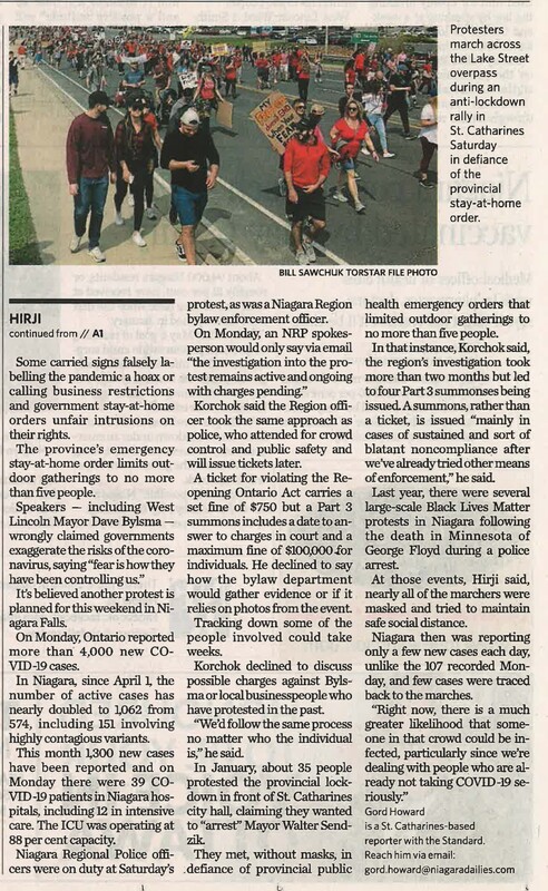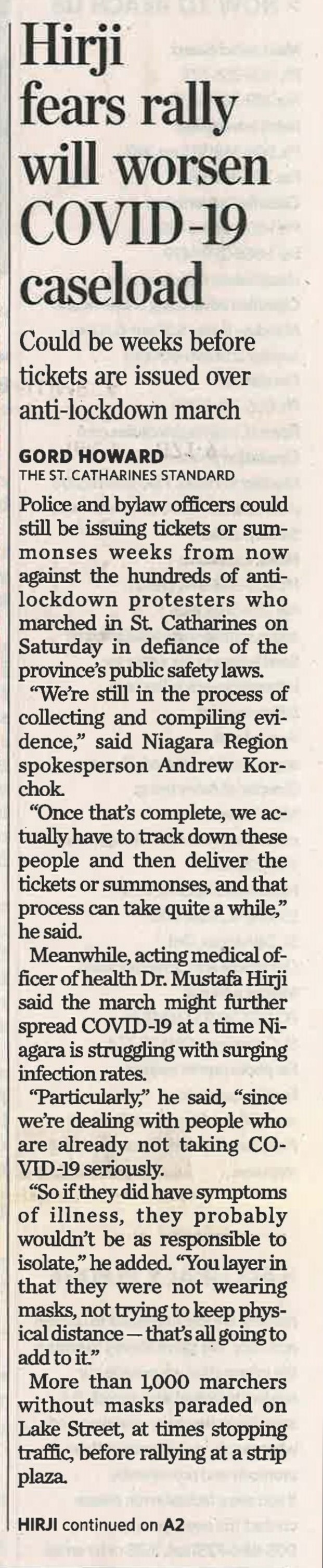 - Hirji fears rally will worsen COVID-19 caseload : Could be weeks before tickets are issued over anti-lockdown march
