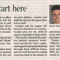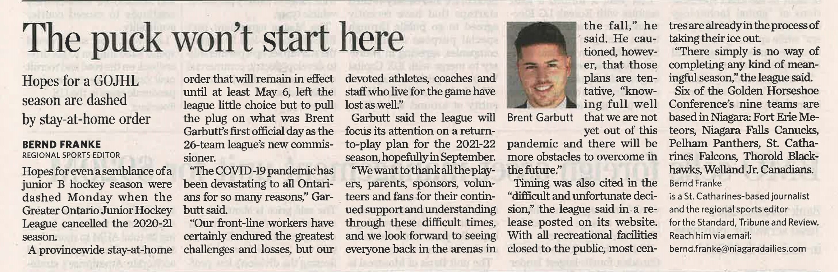 - Garbutt, Brent / junior B hockey / Greater Ontario Junior Hockey League / COVID-19 pandemic / stay-at-home order / Golden Horseshoe